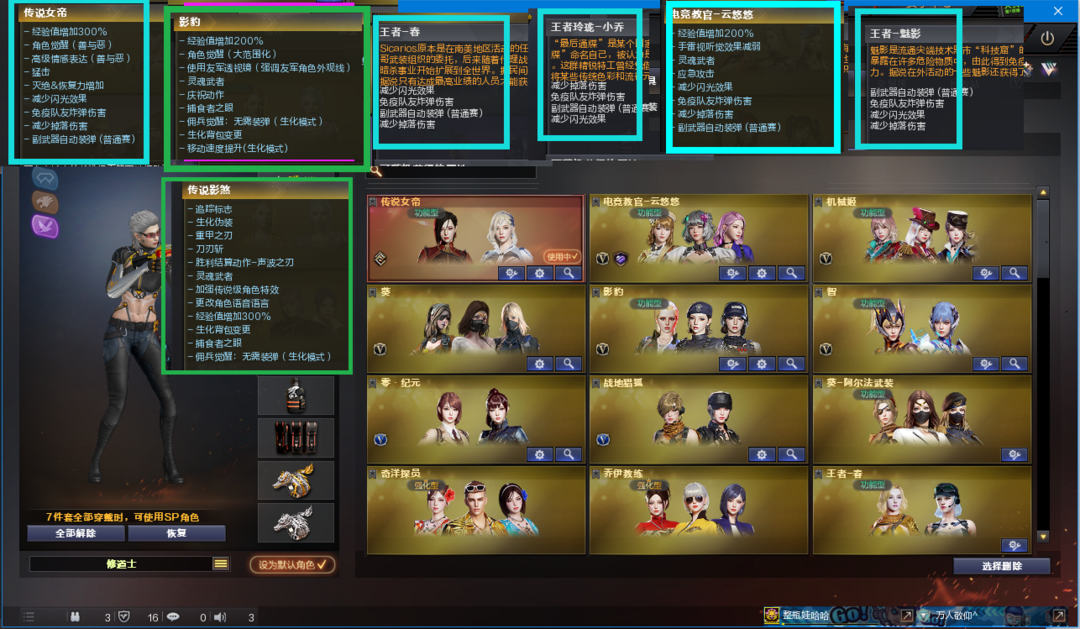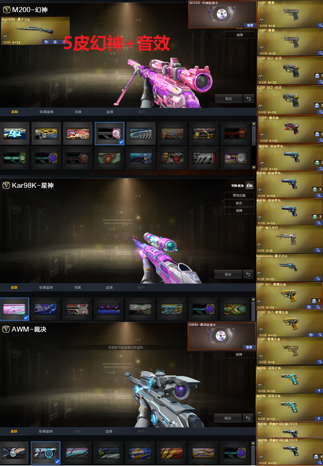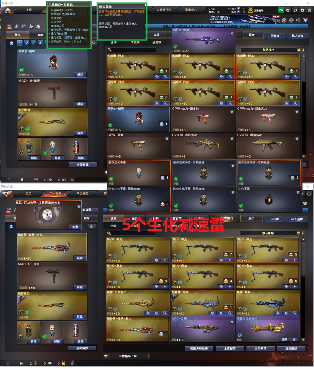 装备描述:排位:可以、、、、、、、、生化全装(变更背包、查看生化僵尸血量):具无需换弹、6烈龙、6盘龙、2炼狱+音效、斯泰尔蝴蝶、死亡之眼、MAC涂鸦、炽芒蝶刃、手斧镜 、5个生化减速雷、超级对讲机、全部弹匣、、、、、、、、爆破四防:5皮幻神+音效(宠儿、冠军之幻、周瑜、2022、电流骇客皮肤)、王者幻神(已觉醒)、98K星神、98K-量子之心、、、、USP神工天巧、USP雷暴王者、USP-雷暴、3个柯尔特-竞技荣光、2个COP幻灵、柯尔特世冠手枪、2个COP雷霆王者、2个23白鲨柯尔特、3把 冠军之特、2把冠军之刃、量子之心左轮、、、、加利尔ACE-天袭、G36幻影、FAMAS G2-天戎、QBZ191-银翼、传说光耀、QBZ-金色蔷薇、QBZ-王者蔷薇、、、幻神音效、裁决音效、白虎音效、天罚音效、毁灭音效、雷神音效、黑骑士音效、、、1套电竞装甲、1套竞技荣光、1套量子之心、2个雷暴王者、7套幻灵、3套雷霆王者、、爆破四防(传说女帝、云悠悠、王者春、王者潘多拉、王者小乔、王者貂蝉、王者魅影、惊若翩鸿)、生化四防(修道士、影豹、紫霞)