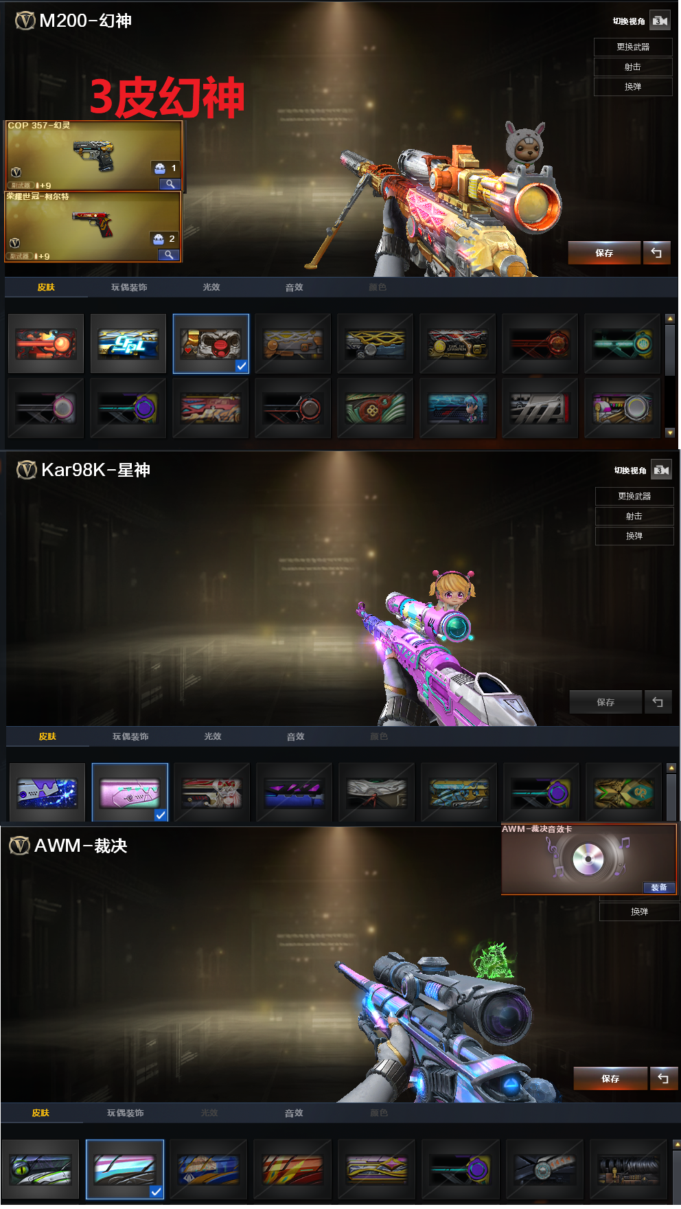装备描述:排位:可以、、、、、、、、、爆破四防:幻神3皮(N9、冠军之幻、纸灯笼皮肤)、98K星神、、、、、、COP幻灵、世冠柯尔特、、、、G36幻影、白虎、QBZ金色蔷薇、、、裁决音效、幻影音效、、、2套幻灵、、、爆破四防(传说女帝、传说艾莉莎、鹰、王者潘多拉)