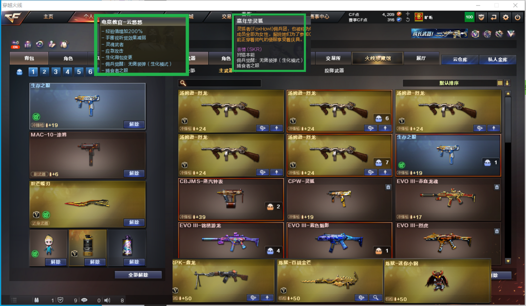 装备描述:排位:可以------------------生化全装四防极品号(生化模式换背包、看血量):无需换弹、5烈1盘、死亡之眼、MAC涂鸦、炽芒蝶刃、生化减速雷、超级对讲机、全部弹匣、、、爆破全装:幻神2皮+音效(24AG冠军、黄忠)、M200-竞技荣光、裁决皮肤带音效、、、USP雷暴柯尔特竞技荣光、、QBZ金色蔷薇、白虎、炽芒蝶刃、、、幻神音效、裁决音效、蔷薇音效、雷神音效、火麒麟音效、毁灭音效、、、1套幻灵、2套竞技荣光、5套雷霆王者手雷、、、、生化人物(云悠悠、嘉年华灵狐)、爆破人物(传说星骇、鹰、暗夜审判)