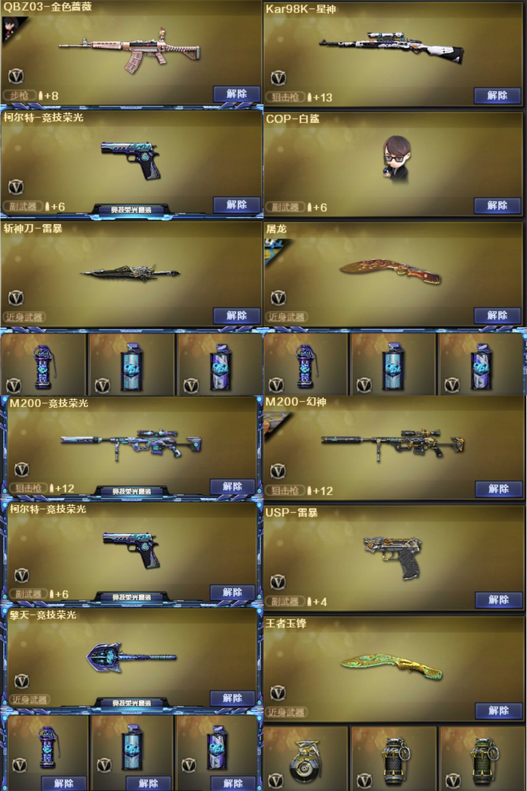 装备描述:禁止利用账号进行开挂、使用辅助违规软件诈骗等违规操作。幻神三件套【m200幻神*2+幻神黄忠皮肤+幻神音效卡】【m200竞技荣光套装+usp-雷暴+四防云悠悠】【98k星神】【白虎】【qbz03金色蔷薇+qbzAGS19冠军皮肤】【朱雀】【barrett金色蔷薇】【雷神+传奇n9皮肤+荣耀之魄皮肤+虎将皮肤+耀金皮肤+雷神音效卡】【毁灭+ags15冠军皮肤+荣耀之怒皮肤+毁灭音效卡】【黑骑士+伏羲皮肤+黑骑士音效卡】【黑龙+361皮肤】【黑武士+典韦皮肤】【王者冰魄 王者炎心 王者玉锋】【王者之心 王者之势 王者之戳 王者之烈 王者之鲨 王者之力 王者之击 王者之啸】火麒麟 黑龙 黑武士 龙血 裁决 雷霆 沙鹰修罗 【屠龙+荣耀之锋皮肤】龙啸 斩神刀雷暴 龙啸烈火龙威【小人呛:m4a1雷神精英刀锋 cop 白鲨 awm灵狐15周年嘉年华】【竞技荣光手雷套 雷暴手雷套|七背包满雷】【角色:迷迭香 王者魅影 王者葵惊若翩鸿修道士】