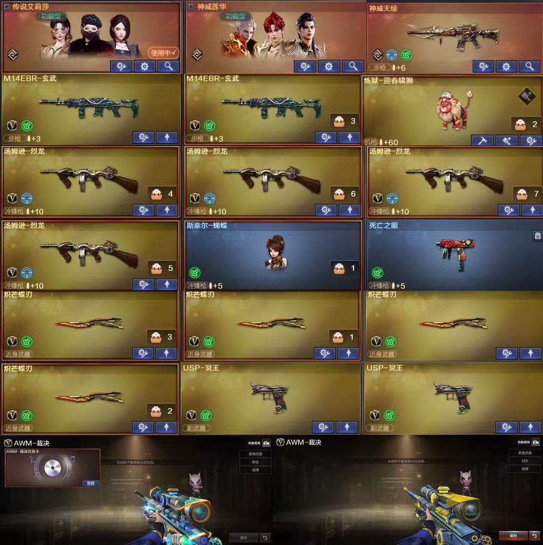 传说艾丽莎神威莲花+天凌+迎春啸狮,双玄武4蝴蝶刀+斯泰尔蝴蝶,裁决三件套+幻神+周瑜皮肤,白虎+音