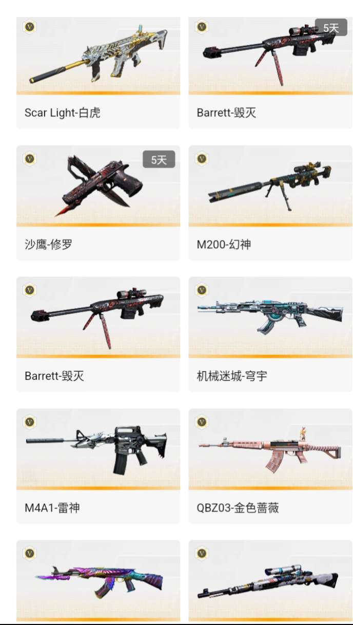 M200幻神宠儿、98K-星神+音效卡、白虎、M4雷神、QBZ金色蔷薇念旧、毁灭