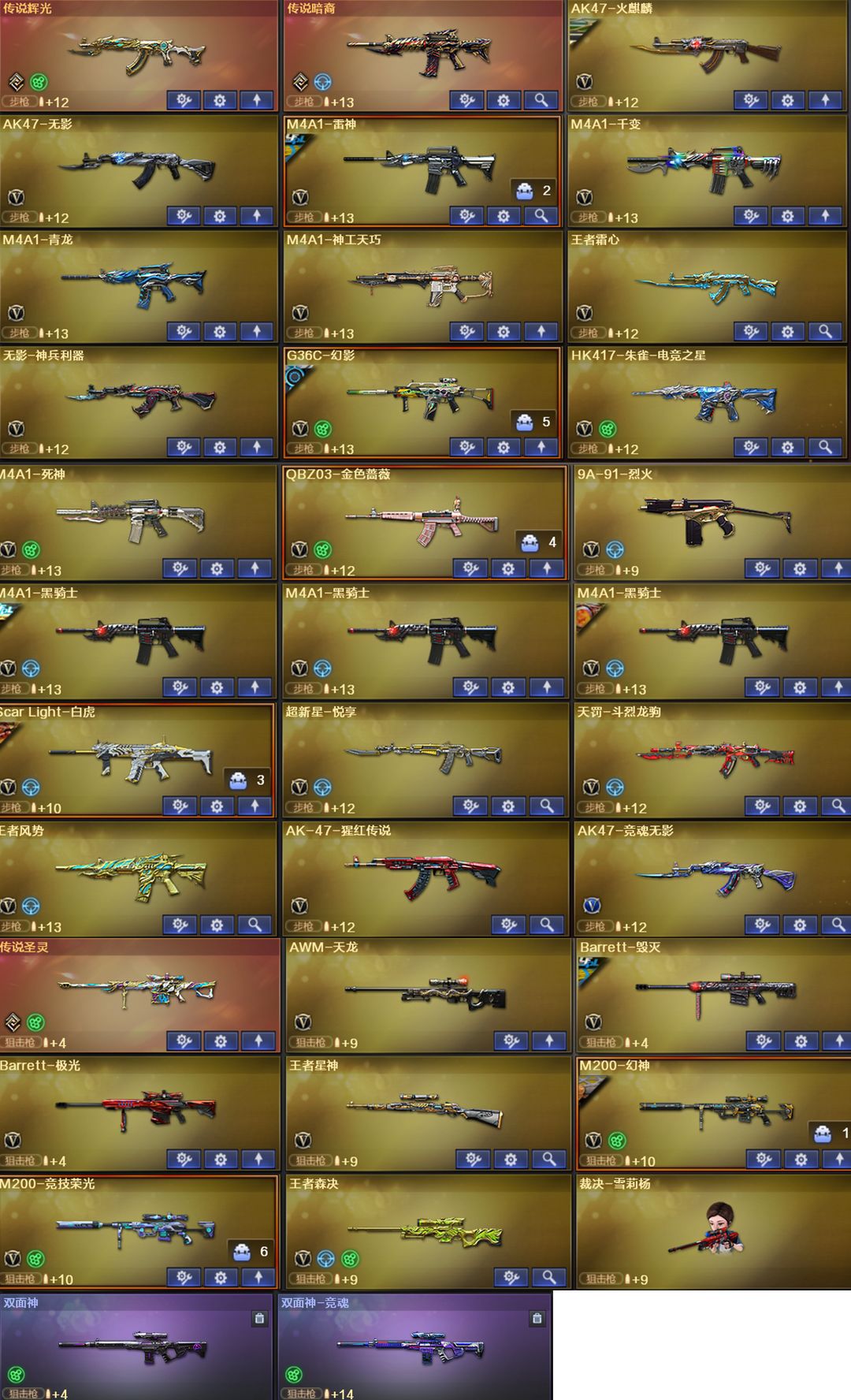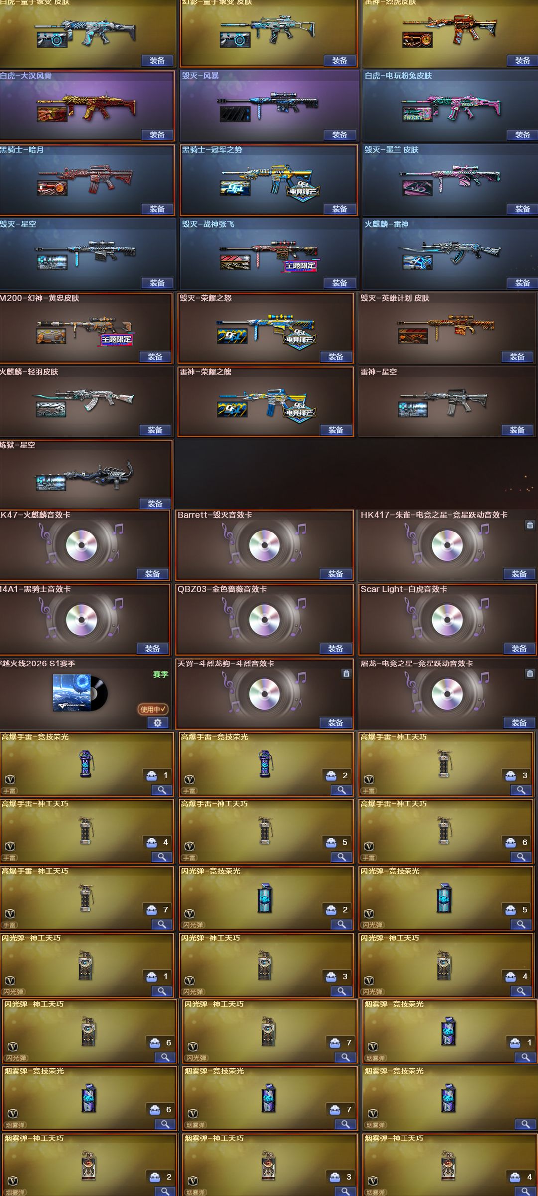 限制: 租号5次及以上 |装备描述:王者武器:王者霜心;王者星神-觉醒版;王者森决-觉醒版;王者风势-觉醒版;超新星-悦享-觉醒版;炫金火麒麟;炫金雷神 英雄武器:龙啸;G36C-幻影;Barrett-极光;无影-神兵利器;烟雾弹-神工天巧;高爆手雷-神工天巧;RPK-盘龙;M4A1-神工天巧;USP-神工天巧;闪光弹-神工天巧;唐刀-神工天巧;沙鹰-修罗;屠龙;炽芒蝶刃;M4A1-千变;M200-幻神;AK-47-猩红传说;擎天;传说辉光;QBZ03-金色蔷薇;沙鹰-天神;传说圣灵;M4A1-青龙;麒麟刺;汤姆逊-烈龙;加特林-炼狱;AWM-天龙;Scar Light-白虎;传说暗裔;M4A1-黑骑士;9A91-烈火;M4A1-死神;AK47-火麒麟;Barrett-毁灭;AA-12-雷霆;AK47-无影;M4A1-雷神;烟雾弹-竞技荣光;高爆手雷-竞技荣光;擎天-竞技荣光;USP-雷暴;闪光弹-竞技荣光;柯尔特-竞技荣光;M200-竞技荣光 角色:传说女帝;电竞教官-云悠悠;传说艾莉莎;晴雅;兰-巾帼英雄;猎狐者;飞虎队;潘多拉;幻影;堕天使;零-水下丽影;救世主-X;妲己;潘多拉-甜心教官;潘多拉-锋芒精英;灵动武