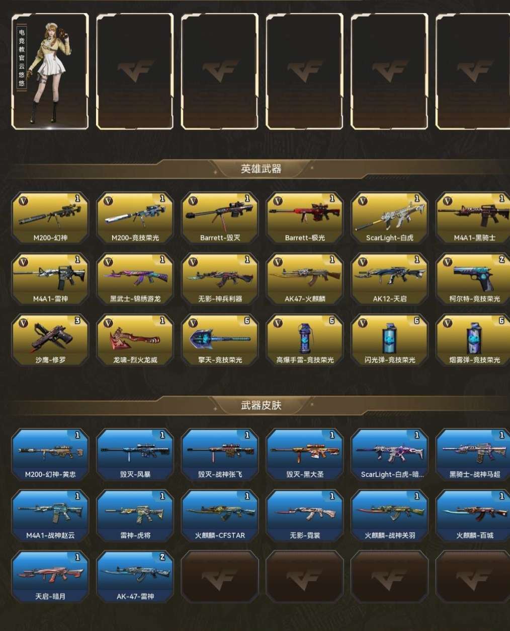 装备描述:毁号,涉及毁坏虚拟财产罪及计算机安全罪,请文明游戏素质游戏,让我们共建美好租号平台 本游戏账号:英雄武器46个 王者武器2个。 装备齐全拥有完美游戏体验。重要的是特殊装备有:电竞教官-云悠悠、王者星神-觉醒版、王者风势-觉醒版、AK47-火麒麟、Barrett-毁灭、M4A1-雷神、M4A1-黑骑士、Scar Light-白虎、M200-幻神黄忠、M200-竞技荣光、擎天-竞技荣光、柯尔特-竞技荣光、烟雾弹-竞技荣光、闪光弹-竞技荣光、高爆手雷-竞技荣光、M4A1-仙界-黑骑士、Scar Light-白虎音效卡、等,随意畅选。 注意事项: A.游戏过程中请不要恶意挂机或者不文明发言 B.恶意挂机、顶号等行为将被拉黑无法再次下单 C.进入游戏后中途请勿退出登陆,否则无法再次上号 D.部分账号由于异地登录可能会出现密码错误提示,通常再尝试5-6次后可上号 喜欢本账号请点 ☆收藏☆ 方便下次租用,谢谢光临惠顾