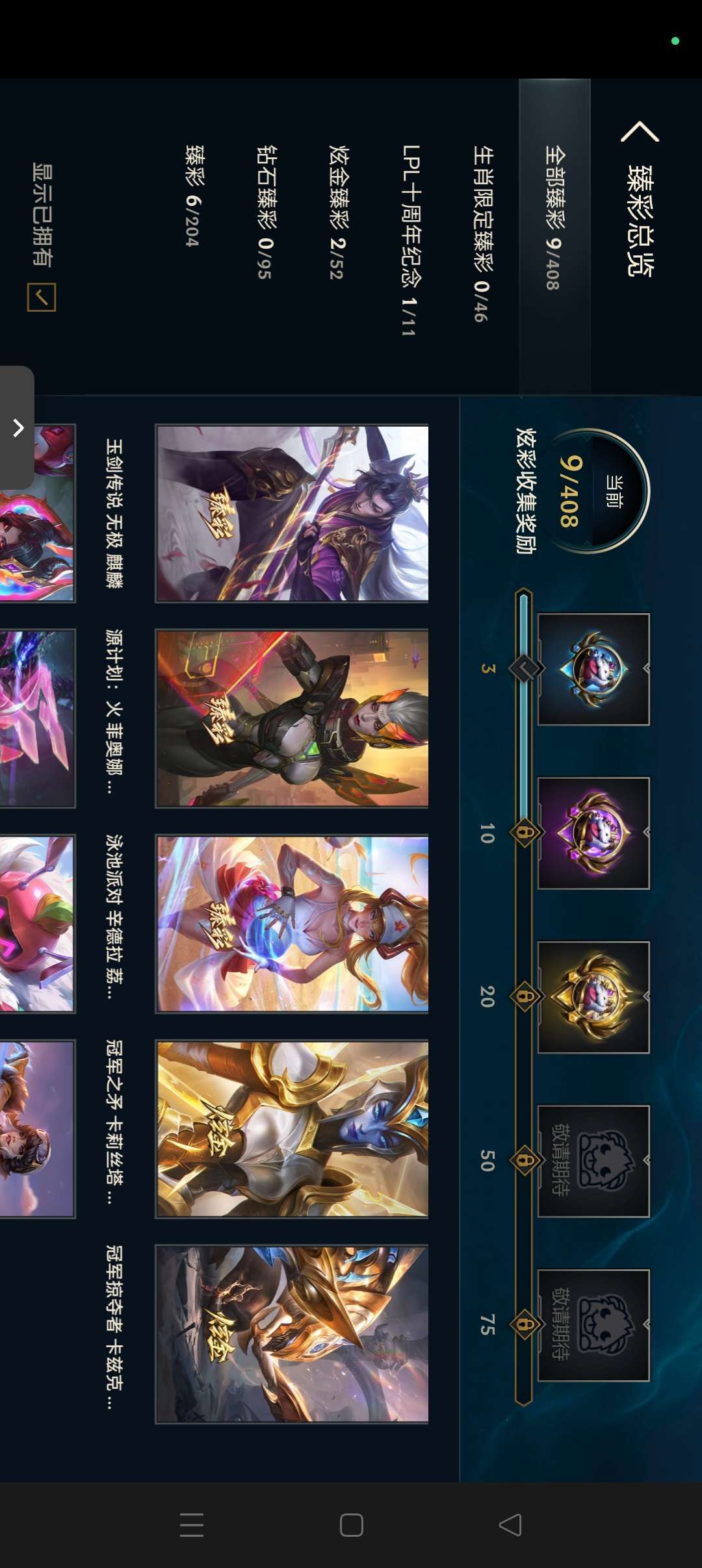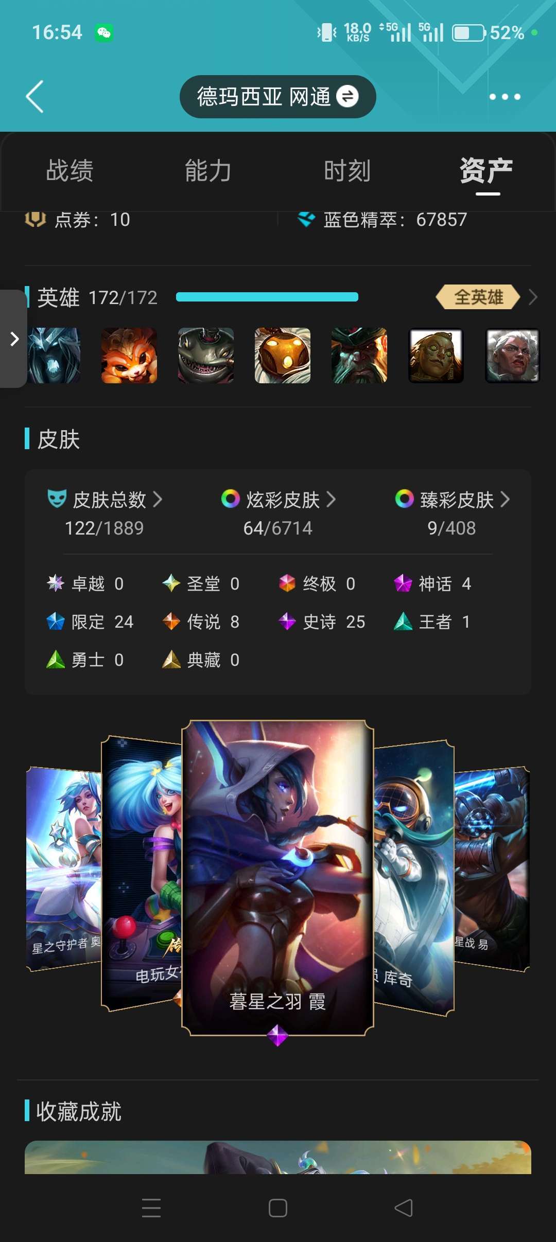 装备描述:主流ad基本都有皮肤,有至臻二代卡莎,皮肤总数122,9个臻彩。貂蝉卡特,fpx盲僧,心之钢ez厄斐琉斯,至臻女帝皎月,星守风女,电玩彩虹马,情人节薇恩等