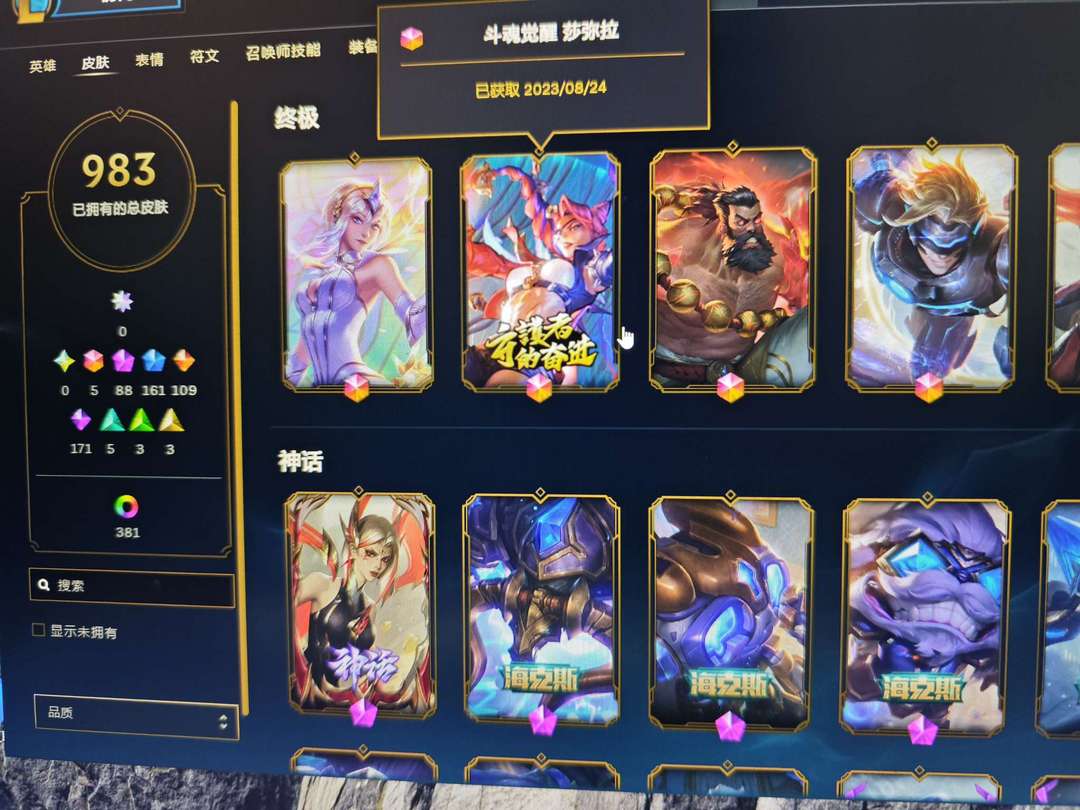 1400皮 5终极 87神话 159限定 109传说 983皮肤 494炫彩 172英雄 翡翠