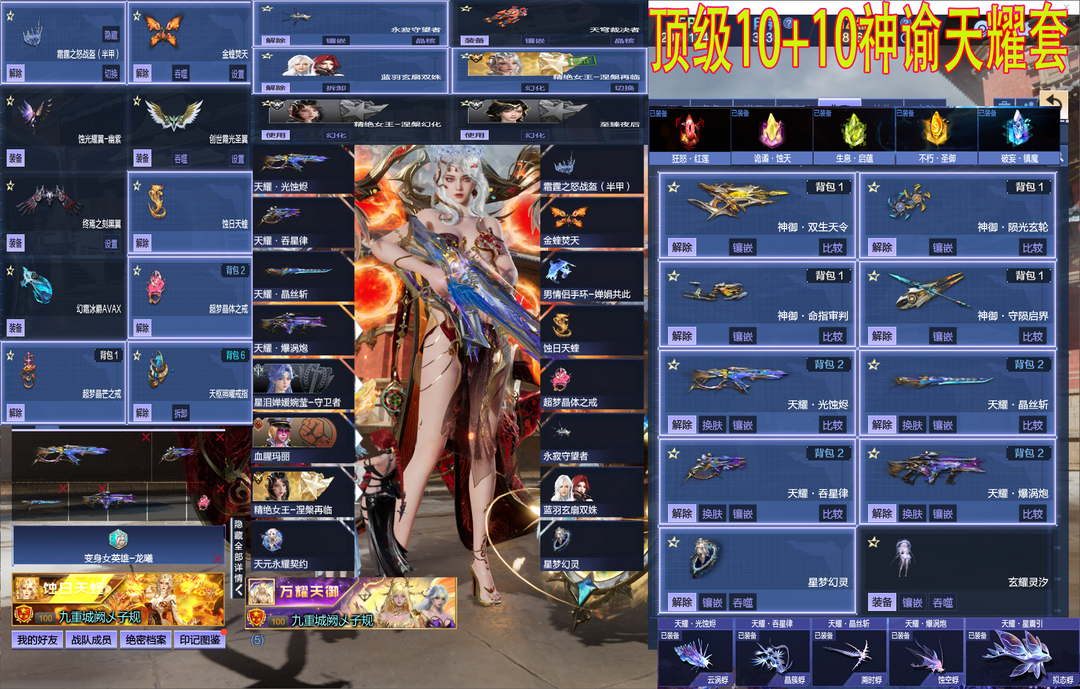 V14图鉴✅⑩+⑩神谕套涅槃再临女王蚀日天蝰霜霆战盔✅天耀套焚霄金翎圣誓✅双姝星寰山海龙曦跑车三臂铠