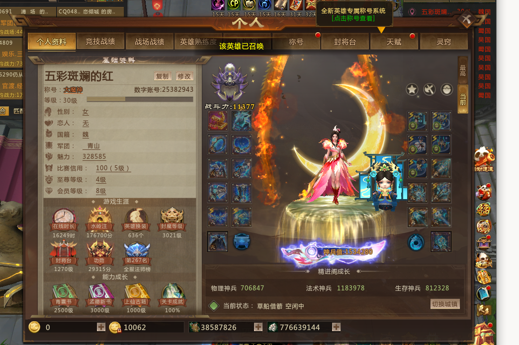 636皮肤 153W神兵 一仙尊 4灵尊 幻神30W魅力超多玩具