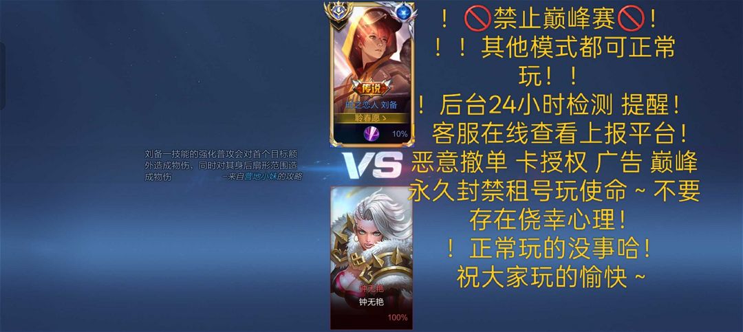 限制: 租号3次及以上 | 撤单率<65%才可租用此帐号装备描述:店铺内大多数号均可低价包天喔 本周截图❤️ 恶意挂机撤单永久拉黑平台记录 禁止巅峰赛● ★开挂美化包等违规第三方软件导致封号将会平台申诉封其租号玩账号并追究其法律责任 ★恶意撤秒改密码顶号拉黑并申诉追回租金 喜欢此账号租号玩平台直接租赁即可 ●以下违规情况扣除保证金①该账号禁止改名 ②违规导致扣信誉积分③非法发言导致账号禁言④聊天记录出现诈骗记录⑤禁止巅峰赛 打巅峰拉黑 租号玩管理员将24小时通过后台监控!