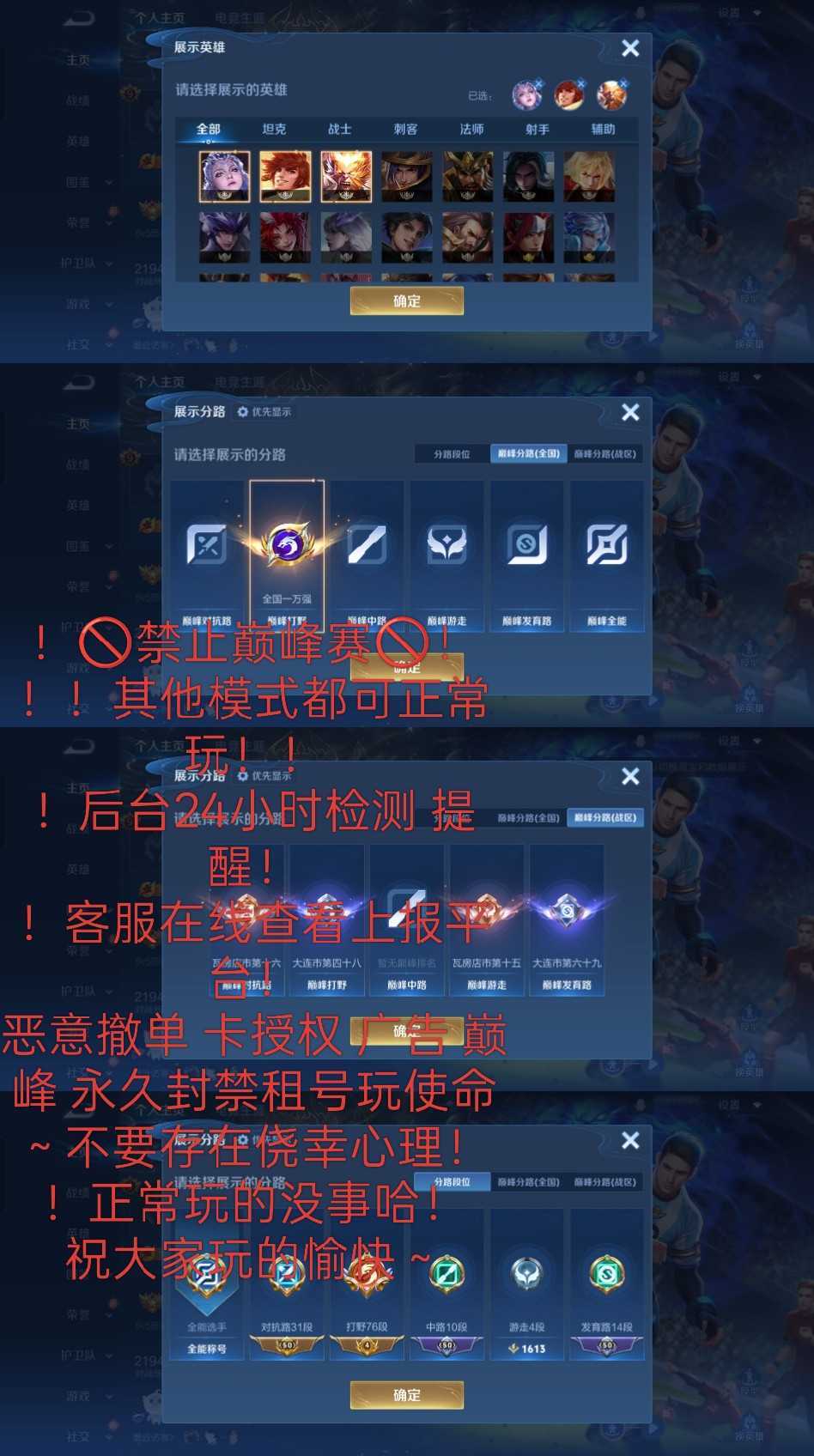 限制: 租号2次及以上 | 撤单率<65%才可租用此帐号装备描述:本周截图❤️ 恶意挂机撤单永久拉黑平台记录 禁止巅峰赛●[挂机的的直接永久拉黑] [恶意撤单 乱撤单的直接拉黑]租客须知[订单结束后 下线后再次.上号的租客店铺自动拉黑。喜欢号麻烦各位续租或者重新下单] [恶意撤单 不说明合理理由的同样拉黑] [恶意挂机送人头全部余额并拉黑] [未满18岁禁止下单支持国家就完事了] [合伙人, 账号已在北京市gaj备案属私人财产恶意游戏行为导致封号将委托律师事务所起诉赔偿] [不良 游戏行为会.上报平台经理处理][更多优质账号收藏店铺挑选定时发红包] ★开挂或者第三方软件导致封号将会平台申诉封其租号玩账号并追究其法律责任 ★恶意撤秒改密码顶号拉黑并申诉追回租金 喜欢此账号租号玩平台直接租赁即可 ●以下违规情况扣除保证金①该账号禁止改名 ②违规导致扣信誉积分③非法发言导致账号禁言④聊天记录出现诈骗记录⑤1500分以下的禁止巅峰赛 打巅峰拉黑 营地~第三方软件将24小时通过后台监控!