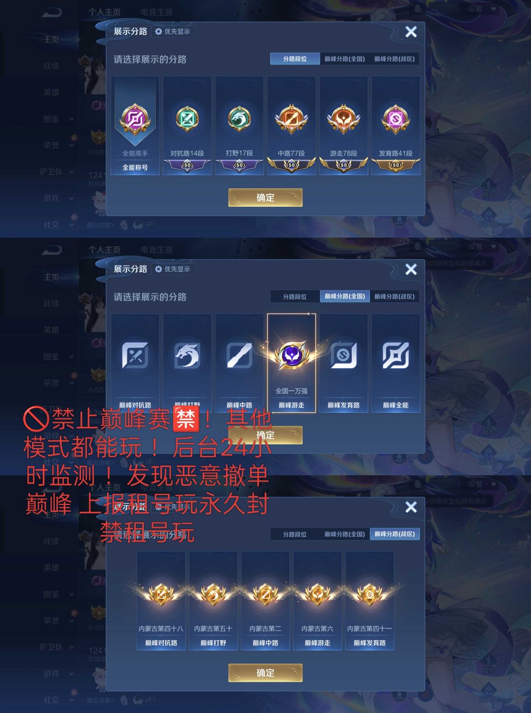限制: 租号3次及以上 | 撤单率<65%才可租用此帐号装备描述:店铺内大多数号均可低价包天喔 本周截图❤️ 恶意挂机撤单永久拉黑平台记录 禁止巅峰赛● ★开挂美化包等违规第三方软件导致封号将会平台申诉封其租号玩账号并追究其法律责任 ★恶意撤秒改密码顶号拉黑并申诉追回租金 喜欢此账号租号玩平台直接租赁即可 ●以下违规情况扣除保证金①该账号禁止改名 ②违规导致扣信誉积分③非法发言导致账号禁言④聊天记录出现诈骗记录⑤禁止巅峰赛 打巅峰拉黑 租号玩管理员将24小时通过后台监控!