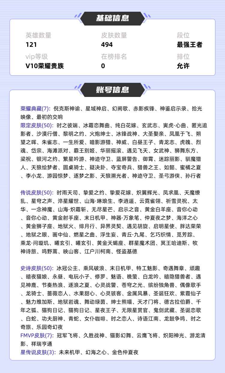 装备描述:>>>>>>毁号,涉及毁坏虚拟财产罪及计算机安全罪,请文明游戏素质游戏,让我们共建美好租号平台>>>>>> 本游戏账号: ,英雄多,皮肤多。典藏皮肤7个,感受典藏皮肤带来的优质体验快感,FMVP皮肤7个,尽情享受FMVP皮肤带来的主角光环, 私人所属英雄皮肤有:诸葛亮 星域神启||虞姬 神鉴启示录||武则天 倪克斯神谕||貂蝉 幻阙歌||瑶 拾光映像||伽罗 最初的交响||关羽 赤影疾锋诸葛亮 时雨天司||妲己 青丘·九尾||妲己 愿照·众生和||上官婉儿 神器·万象笔||孙悟空 地狱火||桑启 鸣野蒿||庄周 牧神诗旅||大乔 挚爱花嫁||嫦娥 器灵·落星盏||嬴政 玄雷天君||墨子 黄金天蝎座||后羿 无尽星芒||后羿 黄金射手座||后羿 千劫归真||王昭君 星穹之声||王昭君 乞巧织情||王昭君 映山客||虞姬 云霓雀翎||虞姬 愿照·岁时盈||虞姬 启明星使||夏洛特 浮生妄||花木兰 燃星之曲||武则天 海洋之心||貂蝉 仲夏夜之梦||貂蝉 曦玄引||貂蝉 遇见胡旋||张良 黄金白羊座||不知火舞 绯月行||澜 愿照·九州拓||孙策 挚爱之约||孙策 时之奇旅||云中君 群星