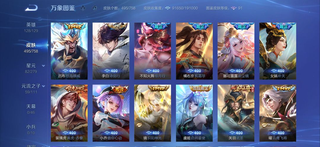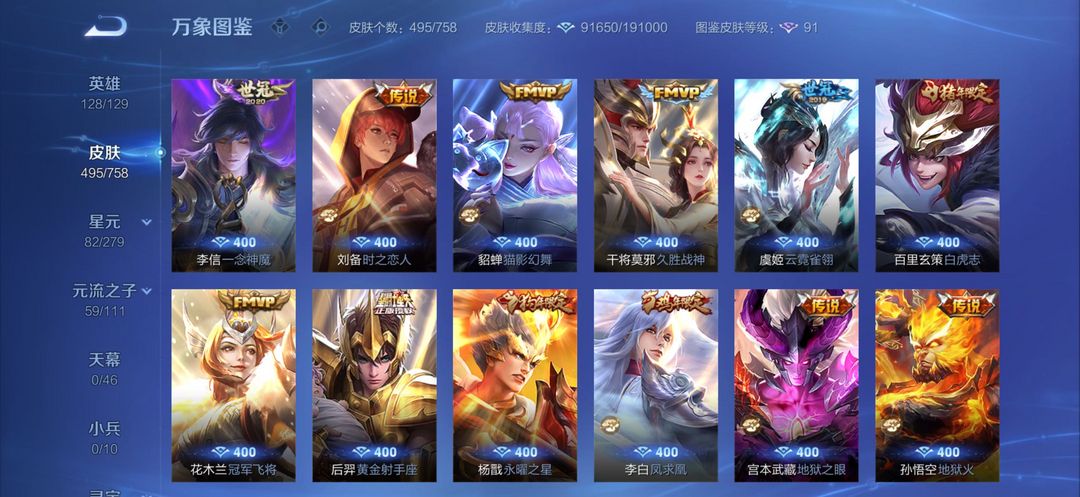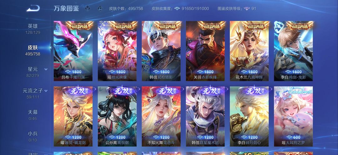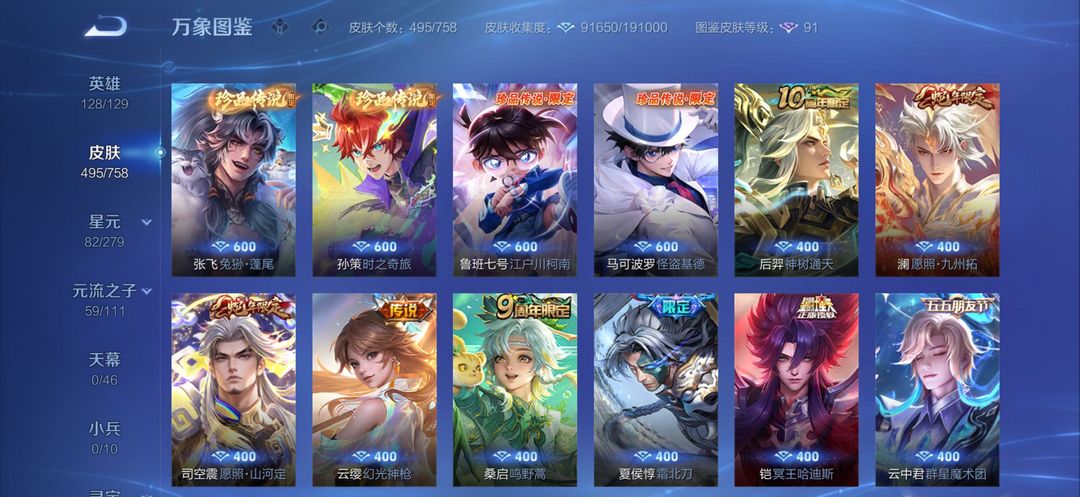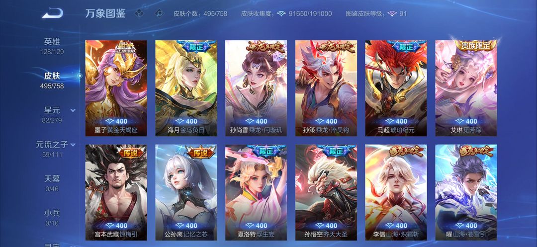 v10 包天特惠 495皮肤 6典藏 5无双 5珍品 男女通用号