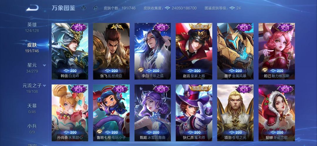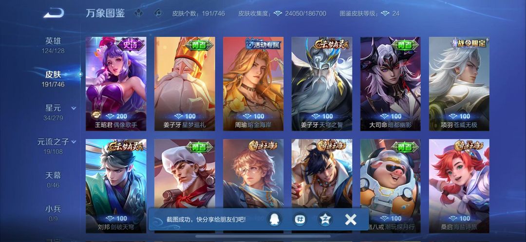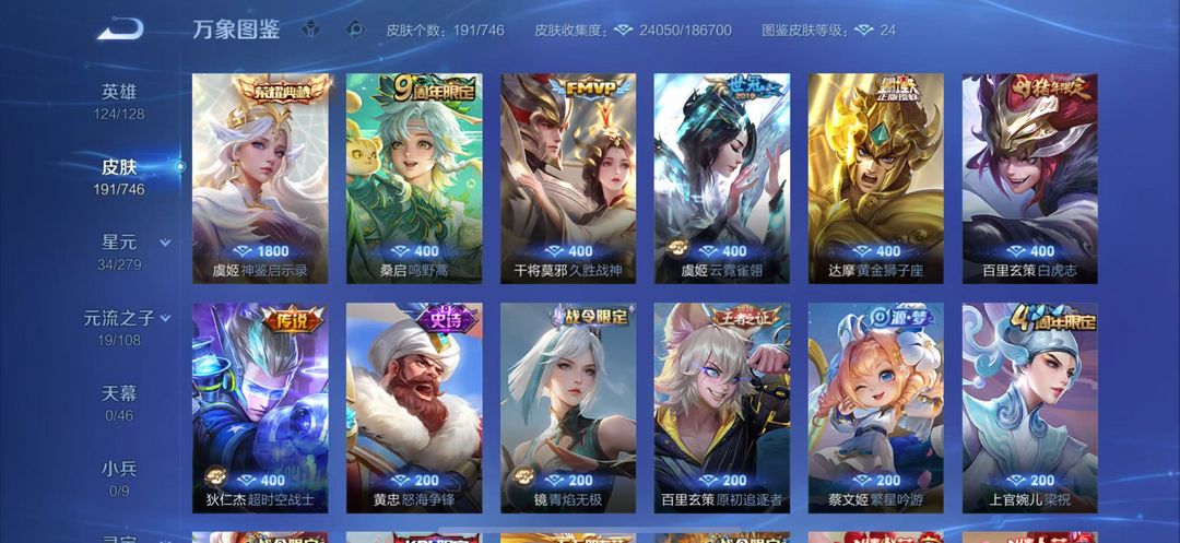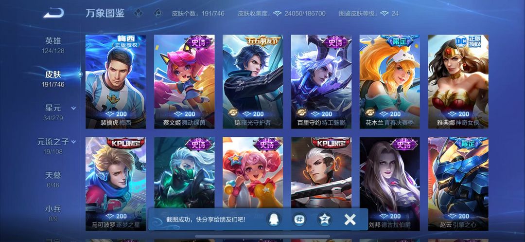 装备描述:全铭文 炸鱼号 191皮肤,124英雄,虞姬典藏神鉴启示录,限定云霓雀翎,梅西,神奇女侠,黄金狮子座,大话西游情人节限定两个