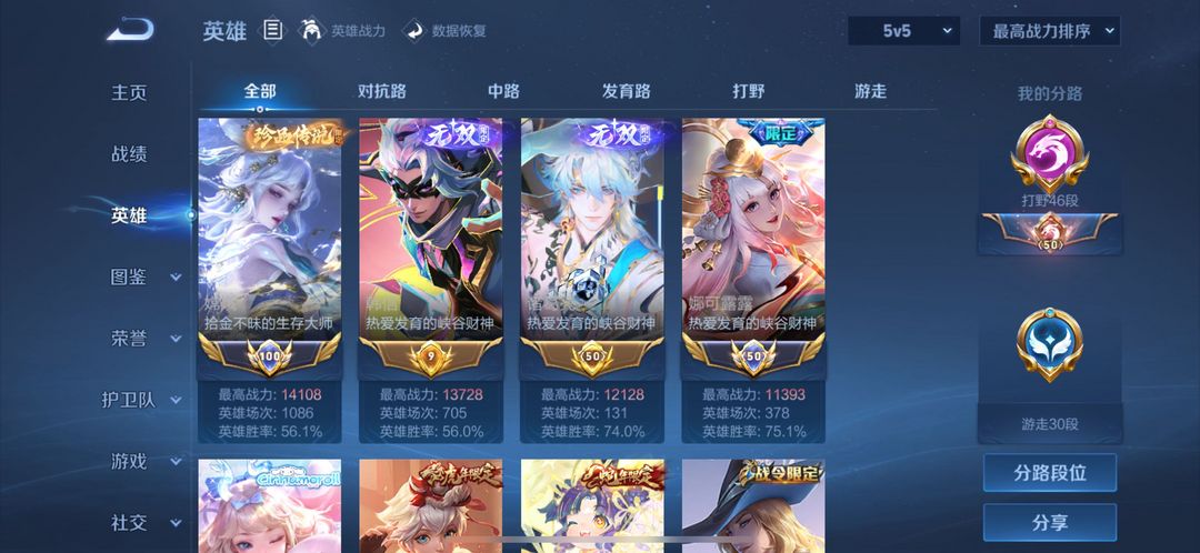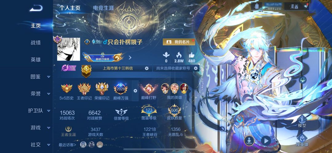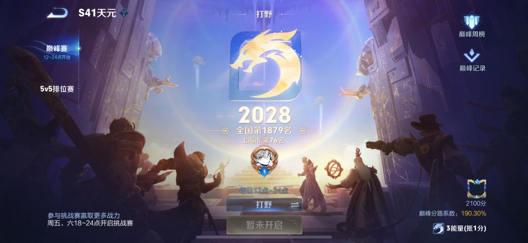 现打野巅峰万强4676名,上海省10露露省13韩信,605皮肤极品号可排位禁巅峰,目前实时全国一千名
