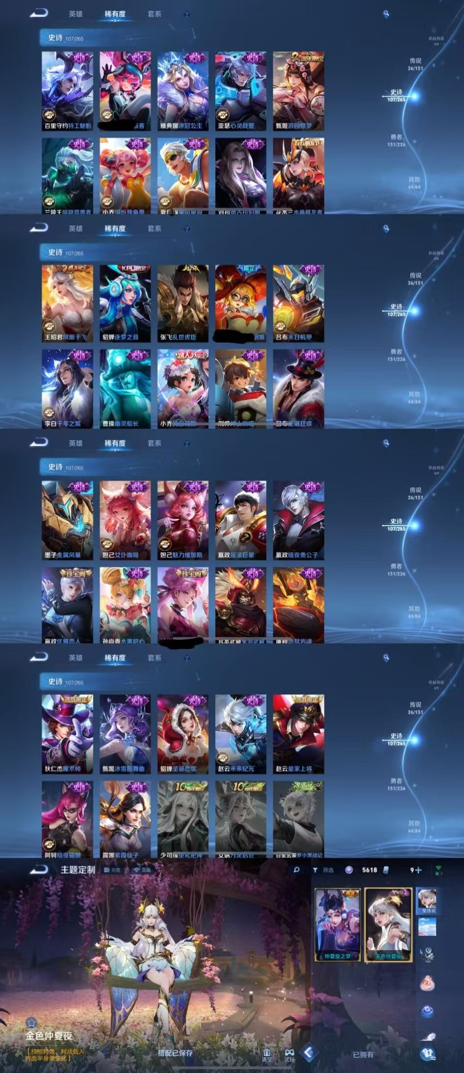 限制: 租号1次及以上 | 撤单率<49%才可租用此帐号装备描述:时间到了还登录白玩或者顶号全部改密拉黑处理永不解除,顶号机器会秒禁玩改密,顶号不仅拉黑还没得玩,赚三两块不容易,请理解谢谢。 ❤❤❤❤❤❤❤❤❤❤❤❤❤❤❤❤❤❤❤ 请勿开挂,挂机,送头,骂人,撤单后游戏等如有违规永久拉黑永不解除。 重置二级密码不要费劲了,号主每天都会上号查看,多行不义必自毙,人在做天在看,多做好事多自律,少做缺德事。 该号英雄126个皮肤314个,典藏3个,无双1个,珍品传说2个,星传说1个,传说26个,史诗107个,祝您游戏愉快~
