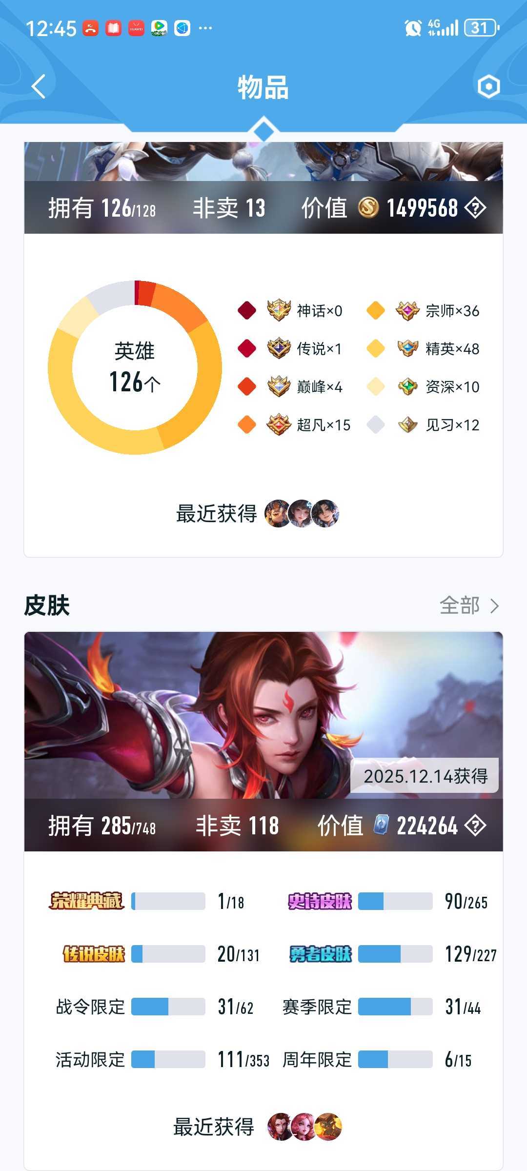 限制: 撤单率<35%才可租用此帐号装备描述:v8典藏诸葛亮285皮虎年限定异界孙尚香情人节限定大圣娶亲露娜一生所爱126英雄多传说多限定