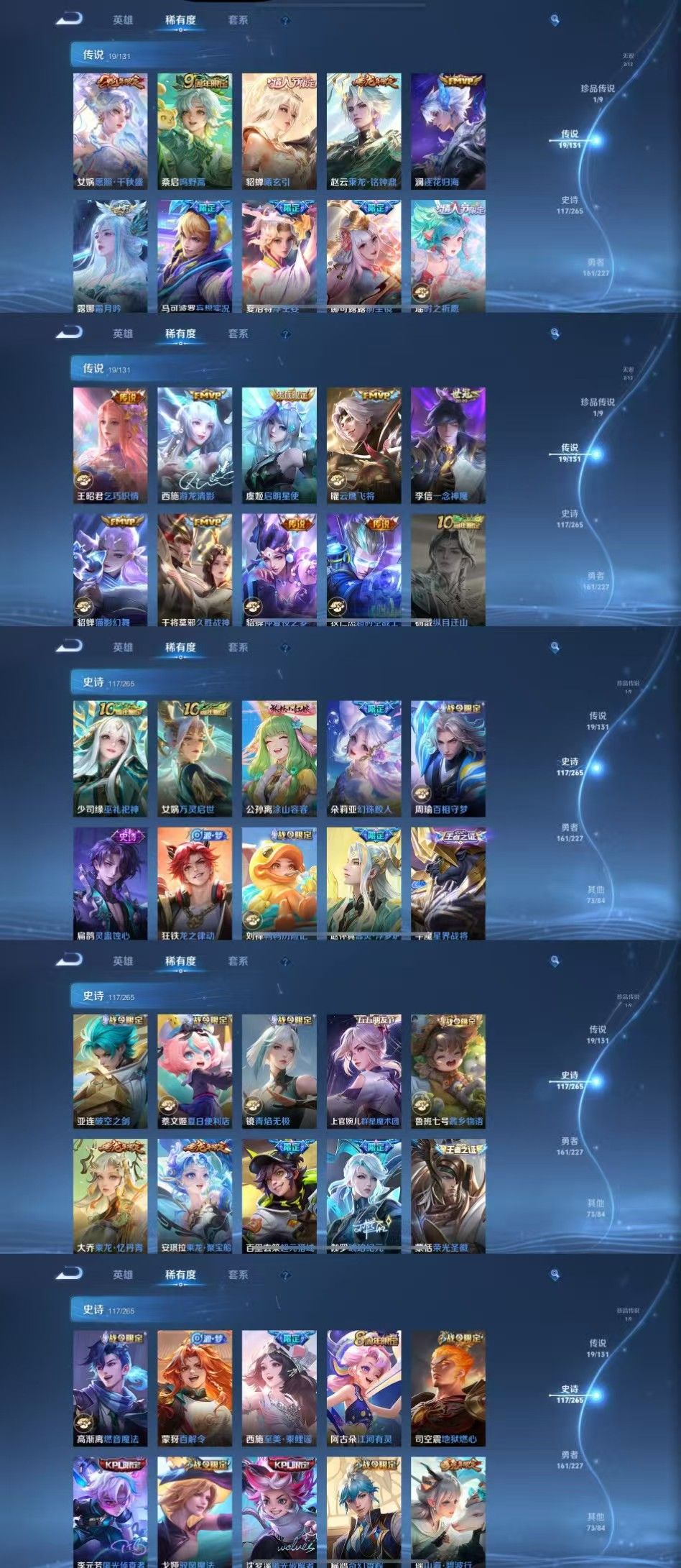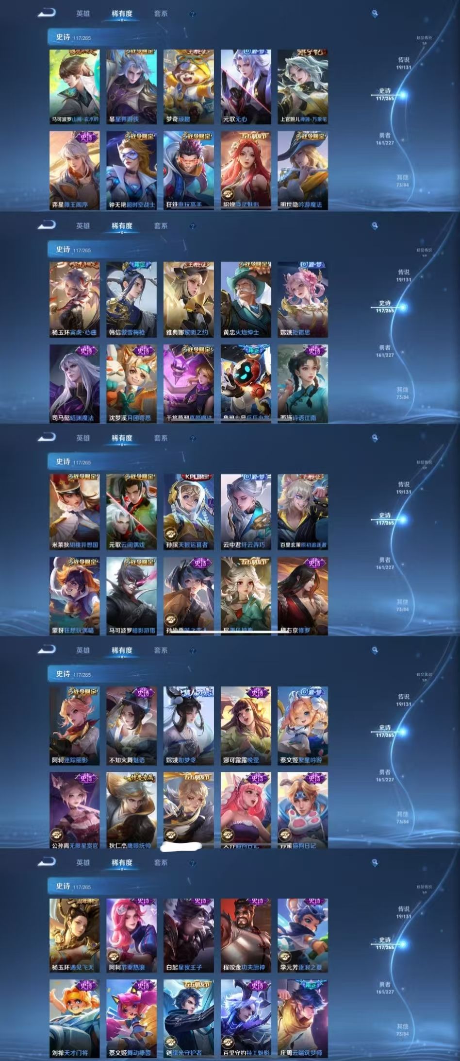 限制: 租号1次及以上 | 撤单率<49%才可租用此帐号装备描述:时间到了还登录白玩或者顶号全部改密拉黑处理永不解除,顶号机器会秒禁玩改密,顶号不仅拉黑还没得玩,赚三两块不容易,请理解谢谢。 ❤❤❤❤❤❤❤❤❤❤❤❤❤❤❤❤❤❤❤ 请勿开挂,挂机,送头,骂人,撤单后游戏等如有违规永久拉黑永不解除。 重置二级密码不要费劲了,号主每天都会上号查看,多行不义必自毙,人在做天在看,多做好事多自律,少做缺德事。 该号英雄127个皮肤375个,典藏2个,无双2个,珍品传说1个,星传说2个,传说19个,史诗117个,祝您游戏愉快~