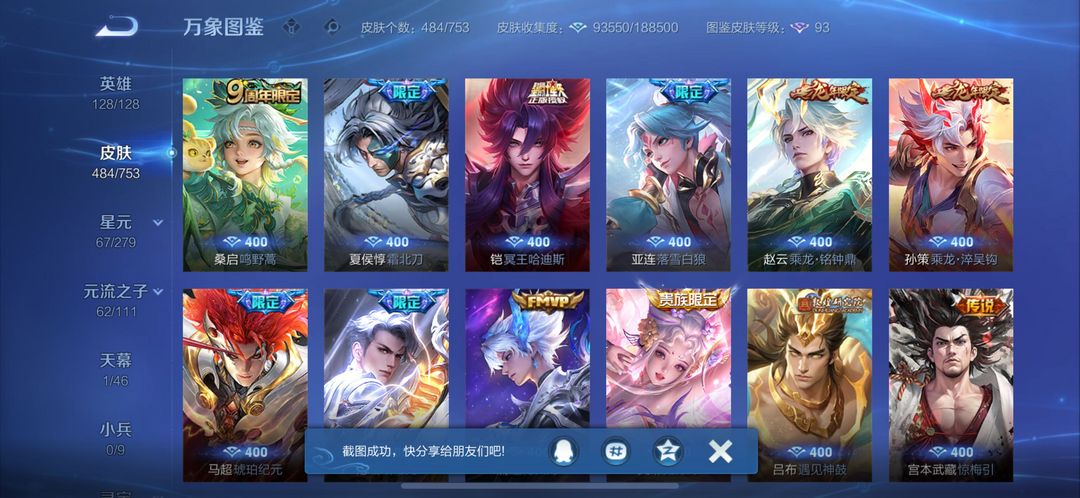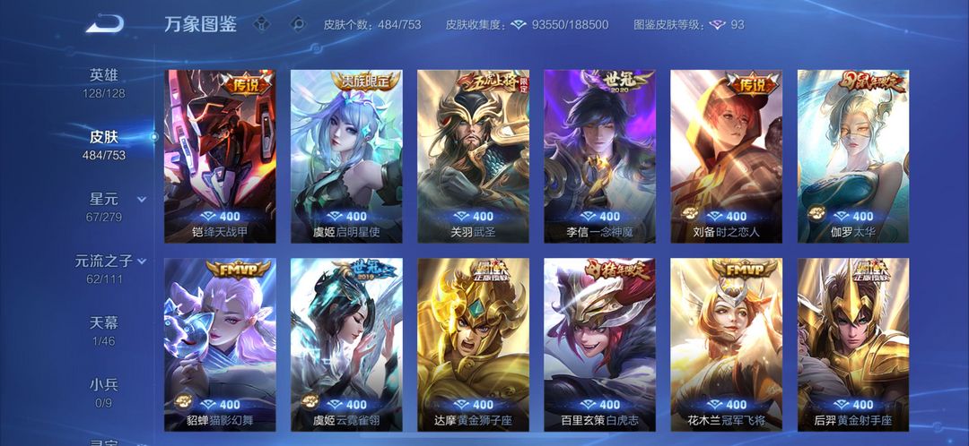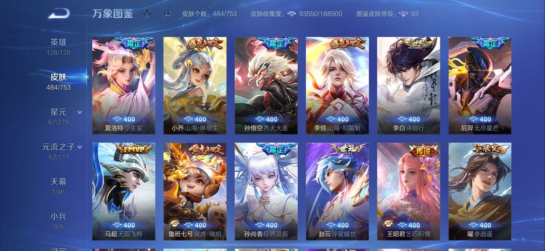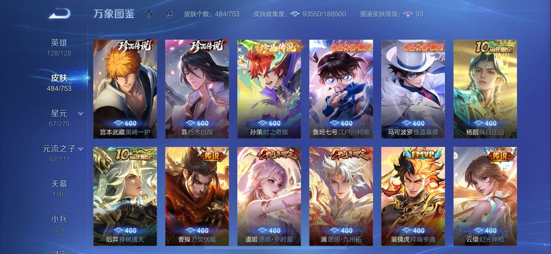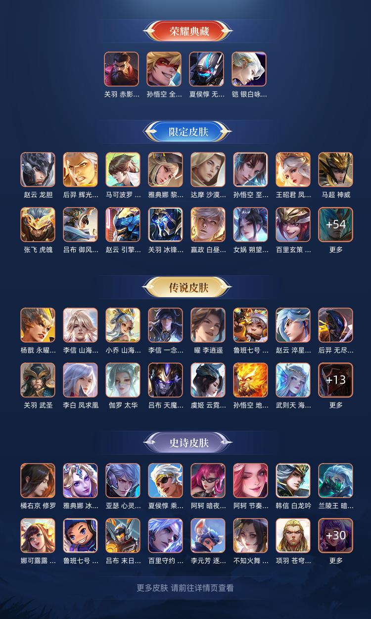 装备描述:铠(铠 神罪,铠 银白咏叹调,铠 冥王哈迪斯,铠 绛天战甲,铠 琥珀纪元,铠 青龙志,铠 曙光守护者,铠 龙域领主);后羿(后羿 神树通天,后羿 石田雨龙,后羿 无尽星芒,后羿 黄金射手座,后羿 完美运算,后羿 阿尔法小队,后羿 精灵王,后羿 辉光之辰);孙悟空(孙悟空 齐天大圣,孙悟空 神迹守卫,孙悟空 孙行者,孙悟空 全息碎影,孙悟空 大圣娶亲,孙悟空 美猴王,孙悟空 西部大镖客,孙悟空 至尊宝,孙悟空 地狱火);狄仁杰(狄仁杰 绮世丹青,狄仁杰 万华元夜,狄仁杰 鹰眼统帅,狄仁杰 阴阳师,狄仁杰 锦衣卫,狄仁杰 魔术师,狄仁杰 超时空战士);孙尚香(孙尚香 异界灵契,孙尚香 水果甜心,孙尚香 火炮千金,孙尚香 沉稳之力,孙尚香 末日机甲);马可波罗(马可波罗 山海·玄木吟,马可波罗 怪盗基德,马可波罗 星界特工,马可波罗 逐梦之星,马可波罗 激情绿茵);曹操(曹操 逐霄之志,曹操 万灵伏威,曹操 决胜大满贯,曹操 天狼征服者,曹操 超能战警,曹操 幽灵船长,曹操 死神来了,曹操 烛龙);鲁班七号(鲁班七号 寅虎·瑞焰,鲁班七号 江户川柯南,鲁班七号 木偶奇遇记,鲁班七号 蔬乡物语