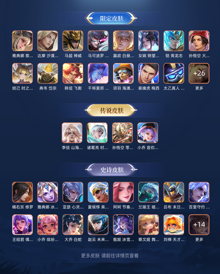 装备描述:梅西 音你心动-小乔,零号·赤焰,无双飞将,山海·炽霜斩,浮生妄,霜月吟,朵莉亚心动手记,神树通天 遇见飞天,李小龙,梁祝,时雨天司,岱宗,神威,时之彼端,飞衡,天狼狩猎者,冰霜恋舞曲,青龙志如梦令-后羿,大圣娶亲,孙行者,猪悟能,五谷丰年,无限倾心-虞姬