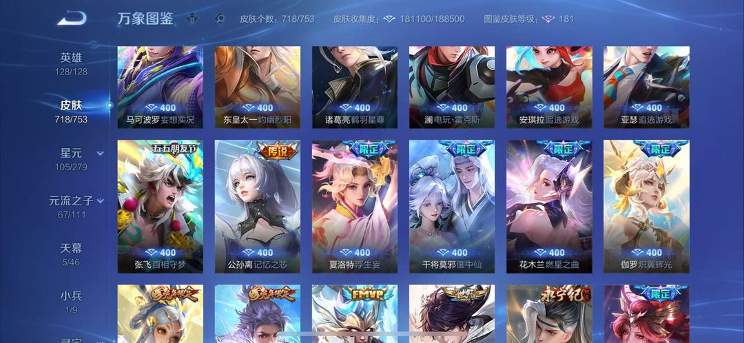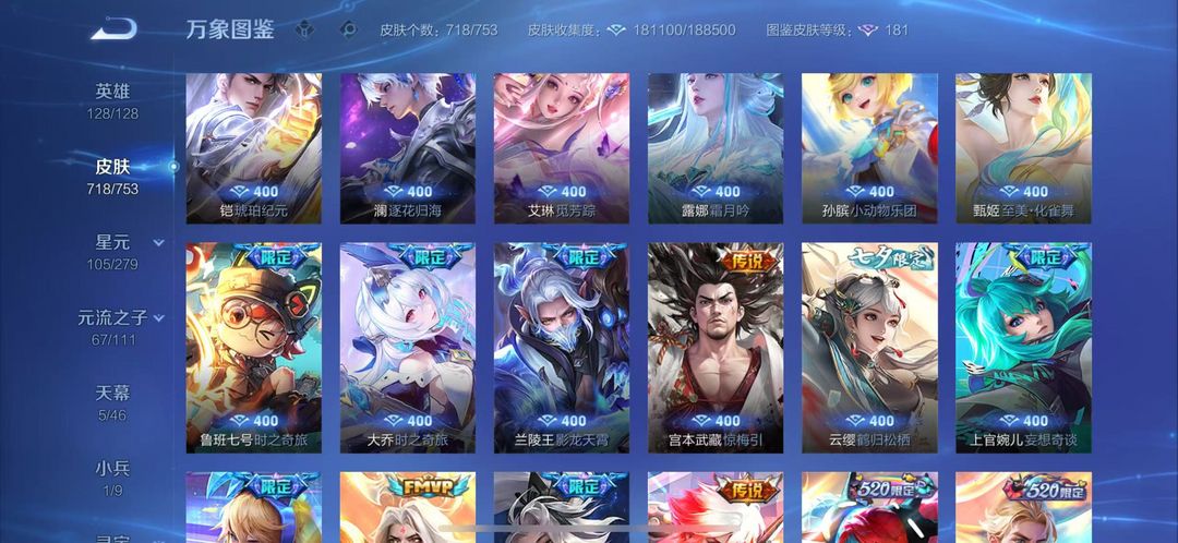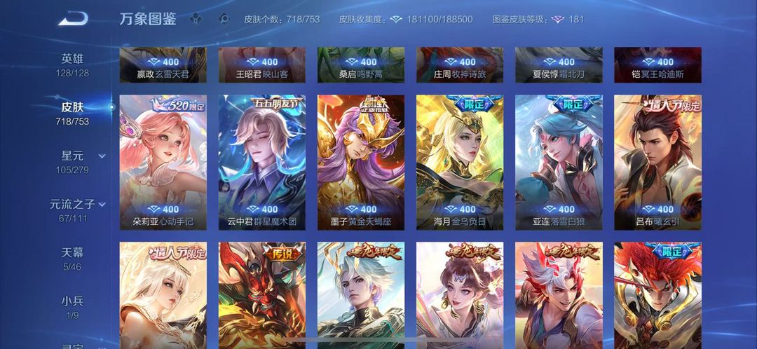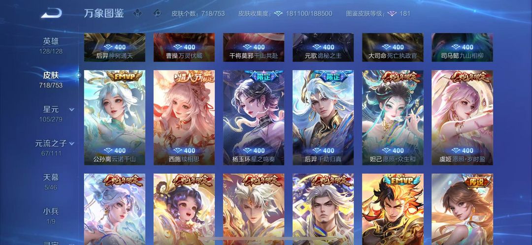 极品男神无双贵族✨718皮满无双满水晶✨最新悟空无双貂蝉慕夏✨325限定皮满珍皮传说✨新皮全补