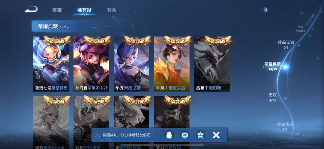 装备描述:不禁言⭐️V10⭐️597皮⭐️15典藏 4无双 3珍品 255限定⭐️女号 诸葛公孙离瑶妲己无双