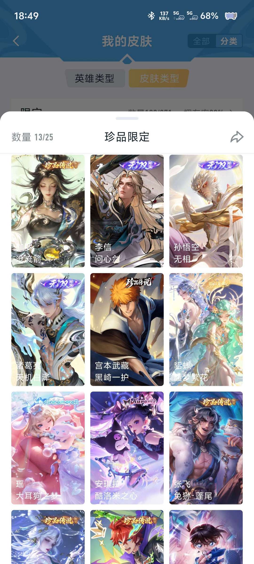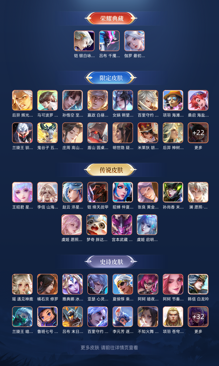 典藏,无双及珍品,300以上皮肤,常规史诗基本都有,上号可以确认,