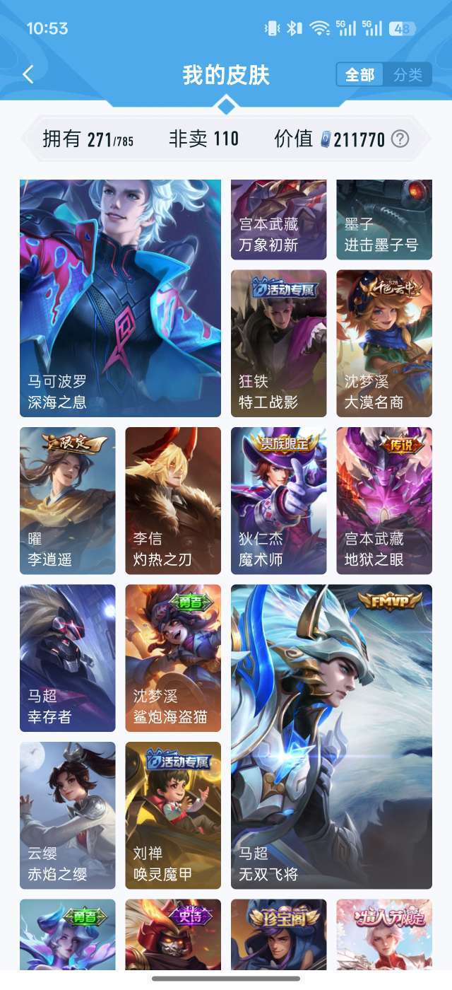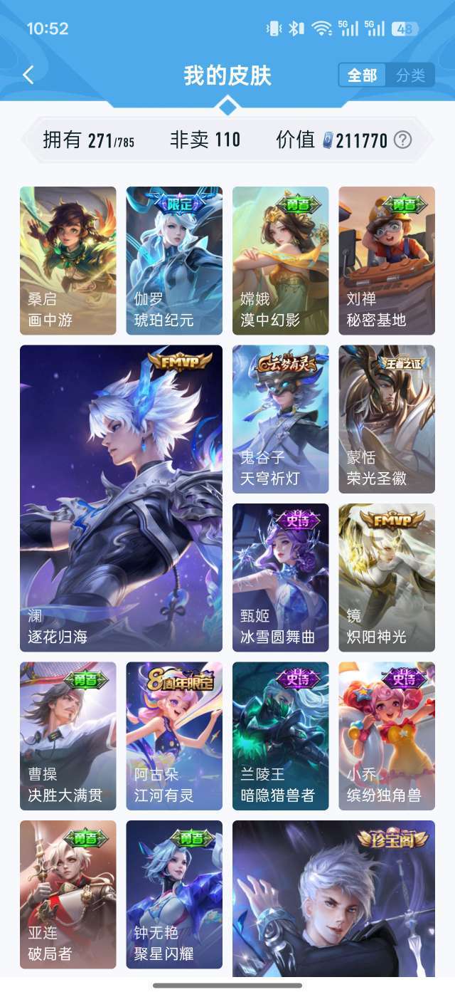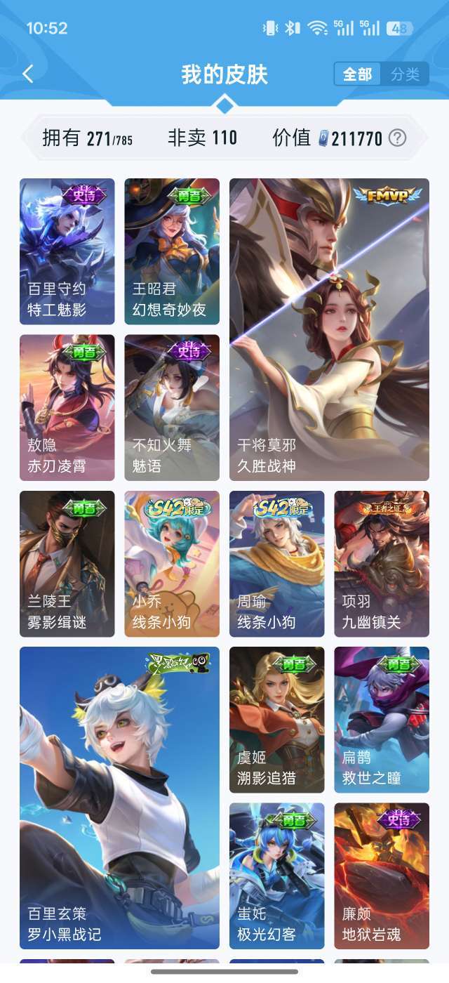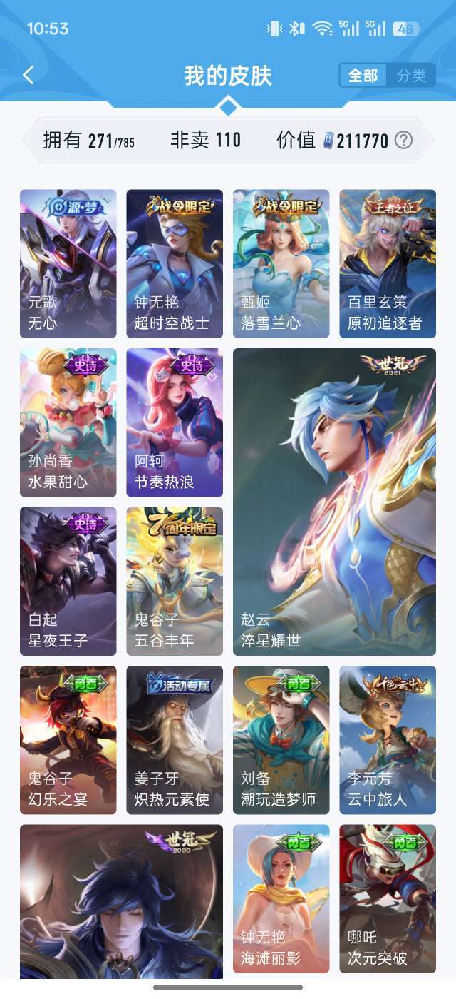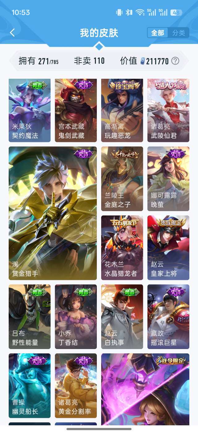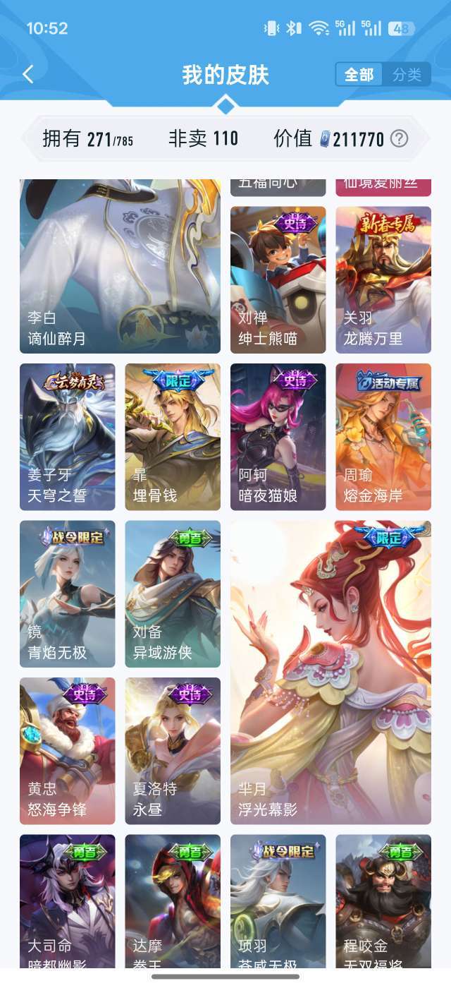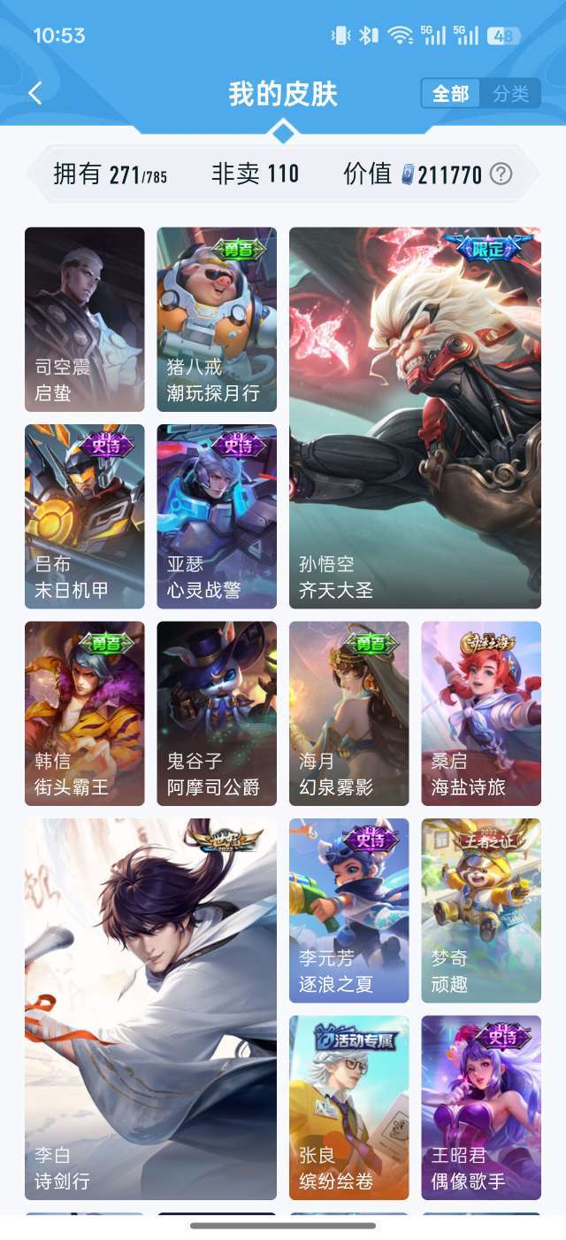 21W贵族值✨271皮肤全英雄 鸣剑曳影/李逍遥/齐天大圣 多限定传说 秒上号不可排位 图片显示部分