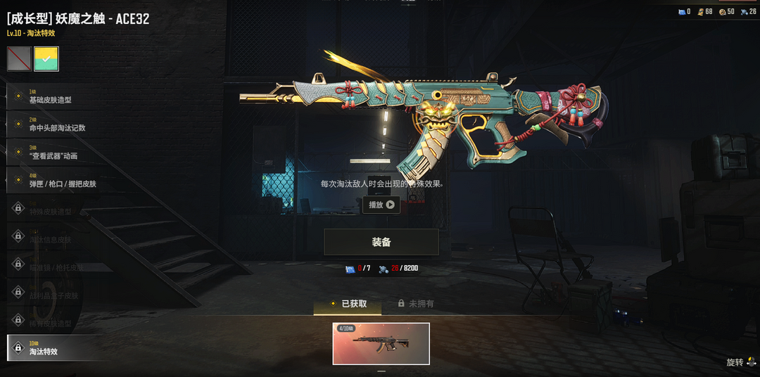 ④级妖魔之触ACE✅异色ACE32✅青花之力M762✅地狱火M4✅金色落叶AKM✅幽冥之握M24✅金