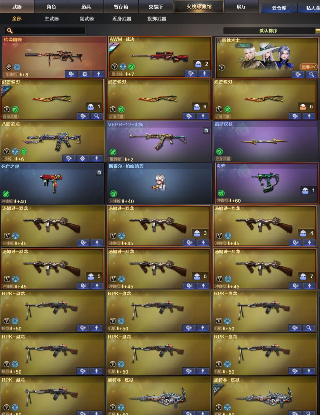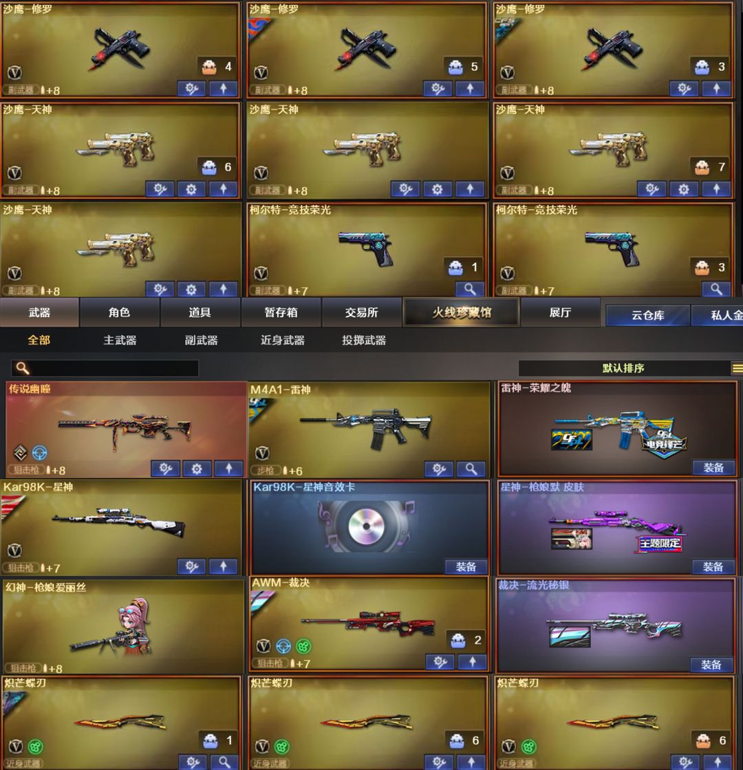 4防毒蝰★ 八面凌龙★ 六烈六盘枪娘炼狱★ 三把蝴蝶刀★ 传说幽瞳★ 星神三件套★ 百V猎手皮肤