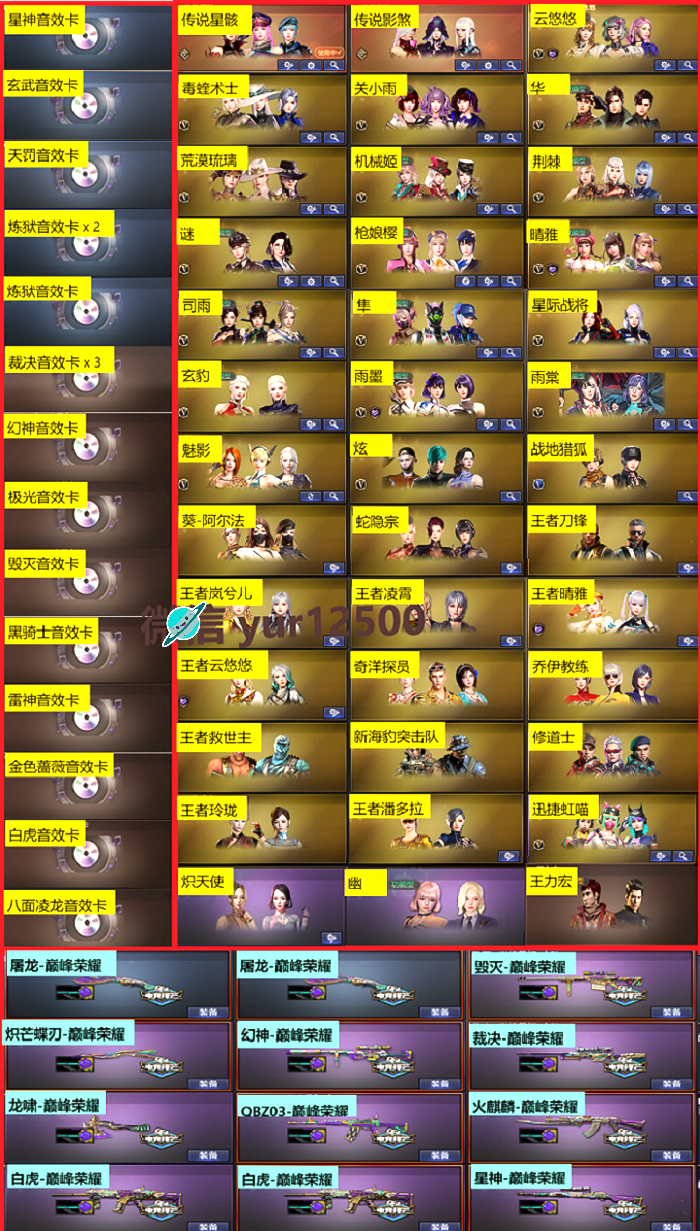 限制: 租号5次及以上 |装备描述:新活动已补:巅峰炽芒活动打穿,传说星骇打穿,、冥王2把、玄豹打穿、王者雷暴穿、法玛斯活动打穿 ⭐开挂必追责,封号赔偿4万元,走法院起诉 ⭐生化满配:满生化角色 2泡泡象 2奇幻万象 3炽芒蝶刃 6盘6烈 2炼狱7皮带卡 八面玲珑满皮带卡 宙斯套 蝴蝶 镇魔者 毒蜂 斯泰尔枪娘 g36c_幻影 玄武带卡 mac龙宝 mac鲨鱼 炼狱秦师 小钢 mk5炽火炎龙 不退包 ⭐满配爆破:传说星骇 满女团角色 传说圣谕 传说辉光序列号7777 传说幽瞳 裁决巅峰荣耀三件套 星神巅峰荣耀三件套 白虎巅峰荣耀三件套 qbz巅峰荣耀三件套 手枪满配 鲨臂 冤种小刀 ⭐动物园:大象 qbz奇幻鲨鱼 qbz柯基嘉年华 qbz斯沃特 m200喜狮迎春 茸茸小松狮 小神龙 马枪 贵族牛ak 猫cat 兔宝宝 cop喵喵 迷你熊 迷你泡泡象 幻神-枪娘 王者汪汪-大炮 王者沙鹰-金戈 毁灭-孙三炮 cop白鲨 街机小灰机 裁决-雪莉杨 usp柯基 usp摇滚 usp小狮子