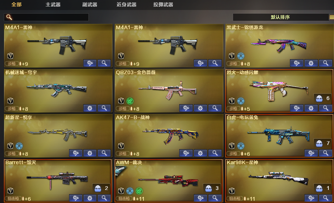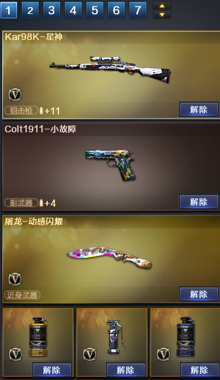 装备描述:英雄武器:Kar98K-星神;AWM-裁决;Barrett-毁灭;白虎-电玩蓝兔;USP-神工天巧;高爆手雷-玄豹;机械迷城-穹宇;M4A1-雷神;AA-12-雷霆;QBZ03-金色蔷薇;烟雾弹-幻灵;闪光弹-幻灵;屠龙-动感闪耀;高爆手雷-神工天巧闪光弹-竞技荣光;烟雾弹-竞技荣光 王者武器:王者之力-觉醒版;王者蔷薇;炫金修罗;超新星-悦享-觉醒版 角色:关小雨;王者影豹;