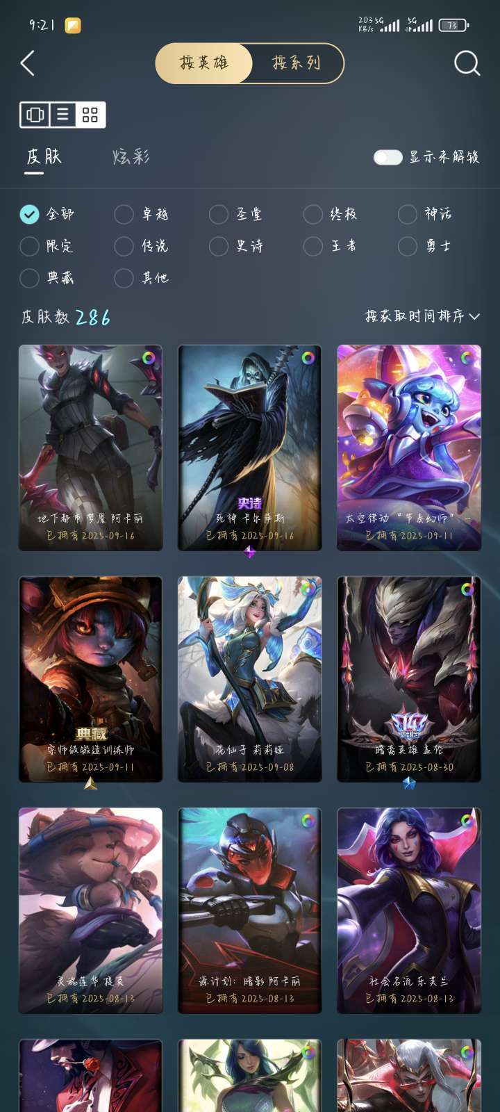 286个皮肤+40个炫彩皮肤,纯个人闲置账号,排位随便打