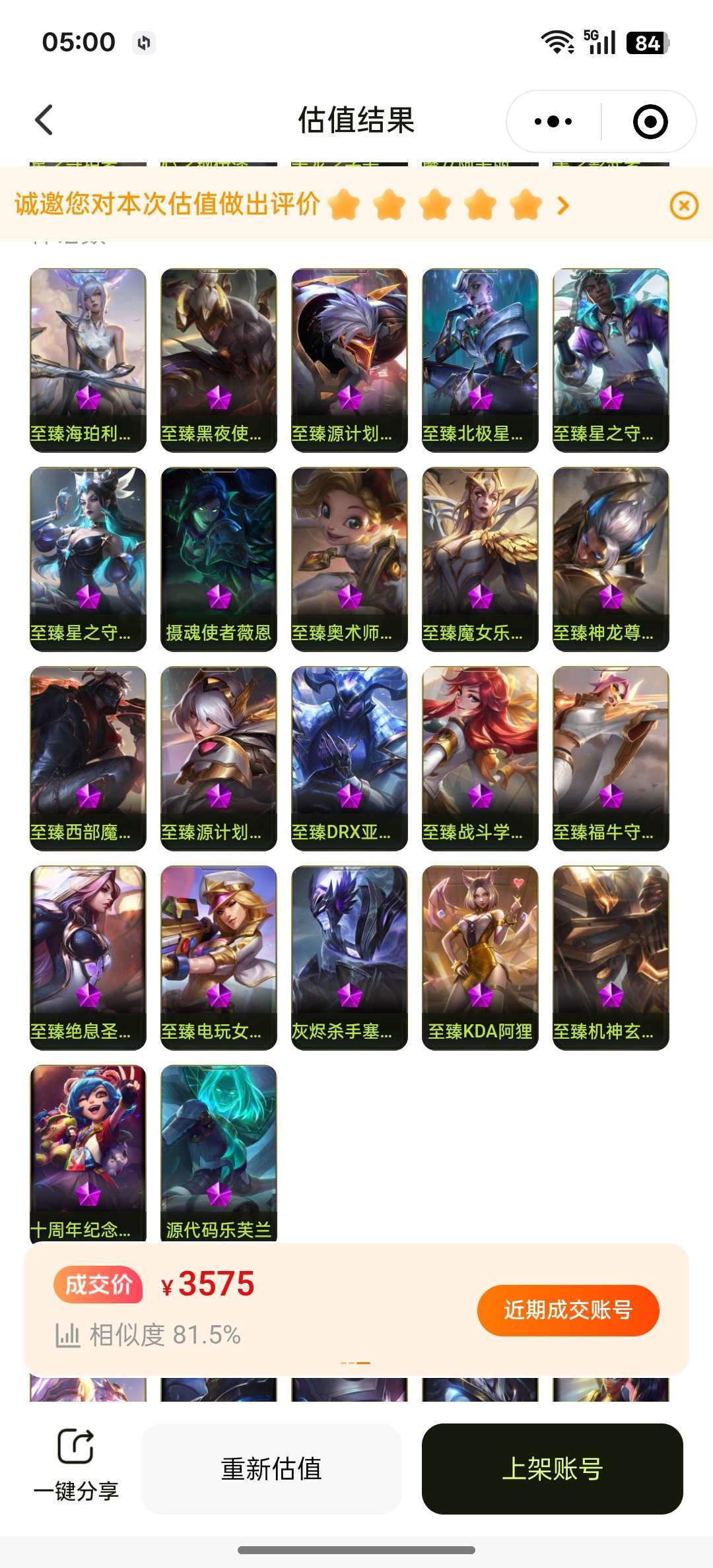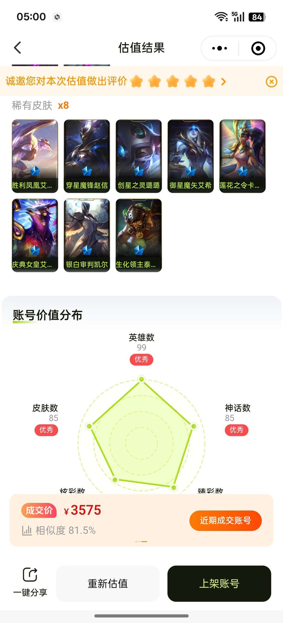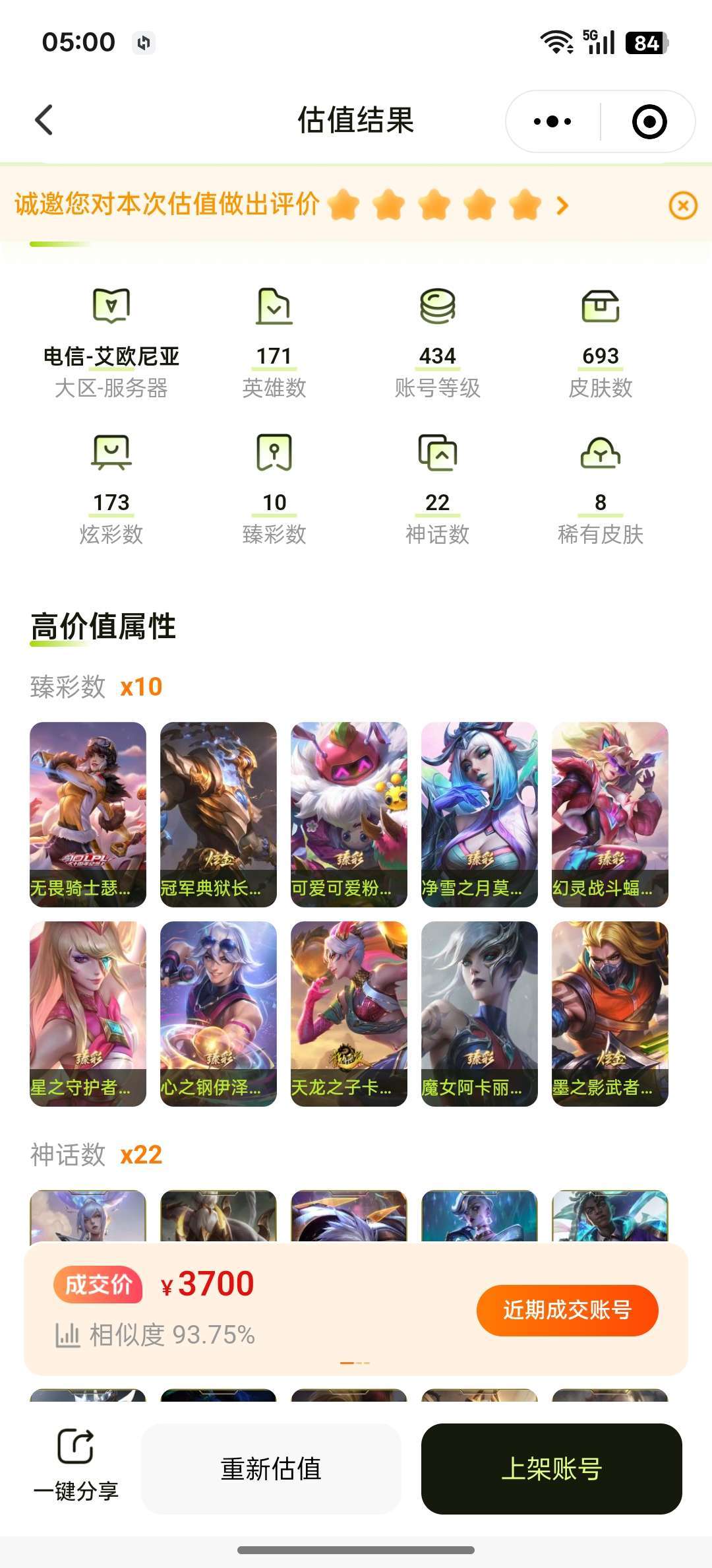 装备描述:艾希御星魔矢 冠军之箭 赵信穿星魔锋 赵云 海牛狼人 蛮子国王 关羽 生化领主 冰鸟钢铁之翼 庆典女皇 卡特 源计划 貂蝉 妖姬长者之森 邪鸦魅影 提莫兔宝宝 圣诞开心鬼 琴女 古琴余韵 电玩女神 豹女 魅惑女巫 枭姬 ez电玩勇者 未来战士 飞机外星装甲 神龙之翼 卡尔玛莲花之令 诺手灌篮高手 勇敢的心 SKT 10个 SSW 两个 暗杀星一套 星之守护者3个 源计划9个 皮肤多 段位不高 居家旅行 带妹必备
