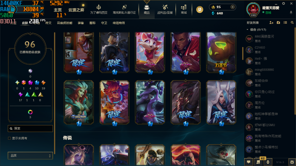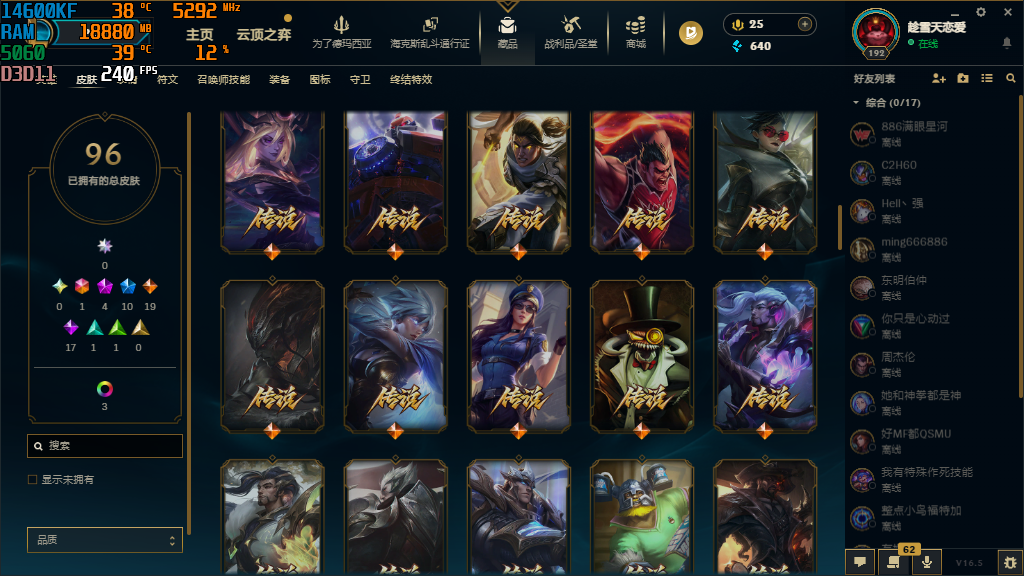 装备描述:泳池派对 瑟提;神龙尊者 炎龙瑟提;弗雷尔卓德 塞拉斯;SSG 霞;绝息圣堂 洛;黑暗骑士 卡莉丝塔;觅心猫猫 悠米;真实伤害 艾克;任性学霸 艾克;黑暗骑士 克烈;西部魔影 卢锡安;觅心游侠 卢锡安;夺命前锋 卢锡安;源计划:升华 烬;神龙尊者 夜月幻龙 亚索;神龙尊者 昼日真龙 亚索;黑夜使者 亚索;腥红之月 亚索;银河魔装机神 纳尔;暗星 卡莎;驯龙女巫 婕拉;幽梦玫瑰 辛德拉;双城之战 杰斯;神王 德莱厄斯;灌篮高手 德莱厄斯;破败军团 德莱文;灵魂收割者 德莱文;海克斯科技 吉格斯;禁魔石巨像 诺提勒斯;苍穹之光 韦鲁斯;夜魔水晶 韦鲁斯;虚空海灵 菲兹;冠军之血 希瓦娜;暗星女王 拉克丝;黎明使者 锐雯;创世之神 玛尔扎哈;神王 盖伦;源计划:暗影 阿卡丽;刺身之拳 阿卡丽;梅花国王 莫德凯撒;至臻 灵能特工 伊泽瑞尔;战斗学院 伊泽瑞尔;冒险精神 伊泽瑞尔;丧尸杀手 潘森;斯巴达之魂 潘森;法国女仆 奈德丽;远土之灵 斯卡纳;光明哨兵 薇恩;防弹武僧 李青;斗战胜佛 孙悟空;暗星 奥莉安娜;龙骑统帅 嘉文四世;海克斯科技 雷克顿;前线指挥官 卡特琳娜;铁血狙击手 凯特琳