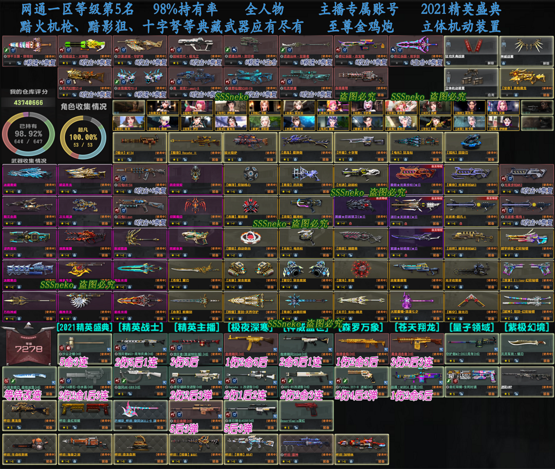 银喵』紫钻☀新绿称98%持☀狱火熔炉☀黯火机枪+黯影狙☀极品7千级☀2021精英盛典【全人物】