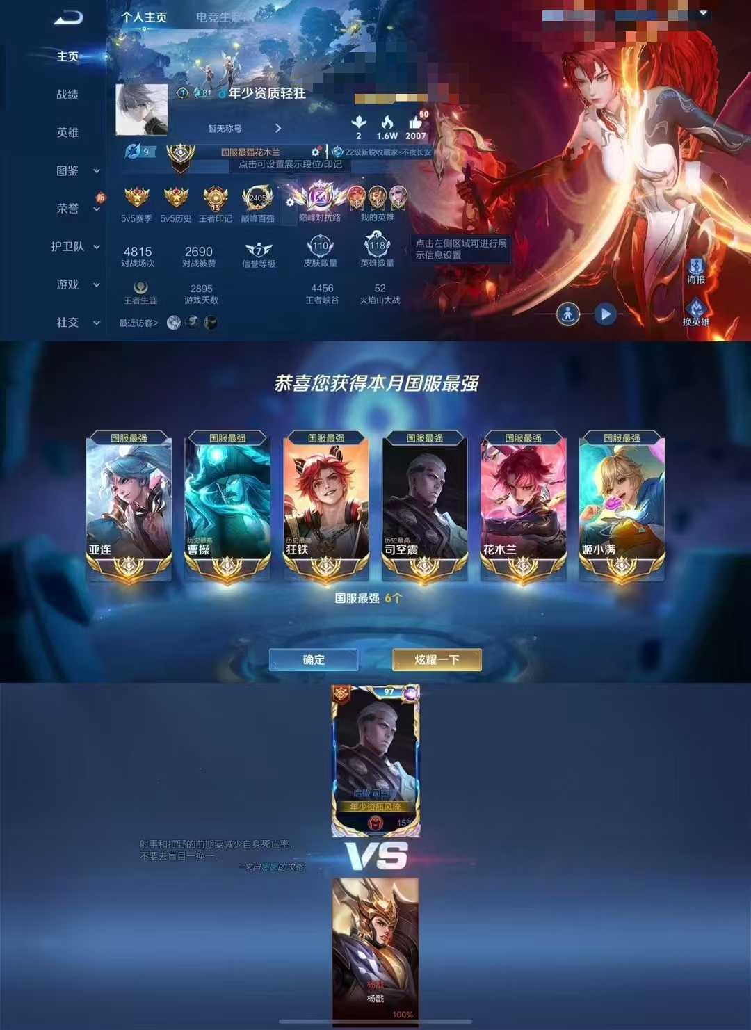 限制: 租号2次及以上 |装备描述:抖音快手搜王者荣耀徐州云宝。老牌良心商户信誉保证,每个月都有大量在榜热门国服高分路。上不去请点与扣好友一起玩,然后回到上号器点启动游戏!禁止利用账号进行开挂、使用辅助违规软件诈骗等违规操作。喜欢本账号请点攻收藏论方便下次租用,谢谢光临惠顾!撤单关营地,直接永久拉黑。