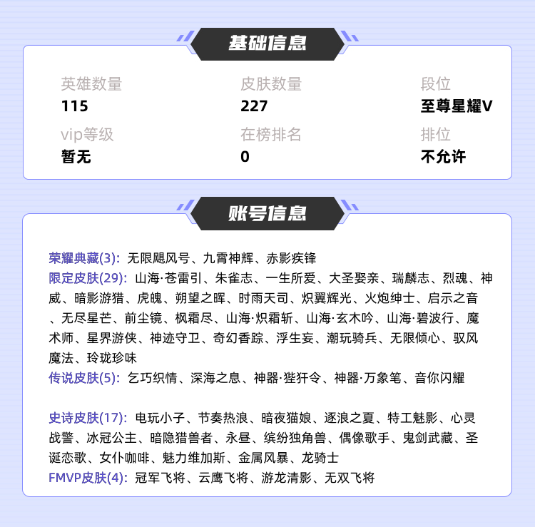 装备描述:>>>>>>毁号,涉及毁坏虚拟财产罪及计算机安全罪,请文明游戏素质游戏,让我们共建美好租号平台>>>>>> 本游戏账号: ,英雄多,皮肤多。典藏皮肤2个,感受典藏皮肤带来的优质体验快感,FMVP皮肤4个,尽情享受FMVP皮肤带来的主角光环, 私人所属英雄皮肤有:夏侯惇 无限飓风号||花木兰 九霄神辉上官婉儿 神器·万象笔||孙尚香 音你闪耀||狄仁杰 神器·狴犴令||王昭君 乞巧织情||马可波罗 深海之息曜 云鹰飞将||花木兰 冠军飞将||西施 游龙清影||马超 无双飞将,等等 注意事项: A.游戏过程中请不要恶意挂机或者不文明发言;B.恶意挂机、顶号等行为将被拉黑无法再次下单;C.进入游戏后中途请勿退出登陆,否则无法再次上号;D.部分账号由于异地登录可能会出现密码错误提示,通常再尝试5-6次后可上号。 |||||||||>喜欢本账号请点 ☆收藏☆ 方便下次租用,谢谢光临惠顾|||||||||禁止利用账号进行开挂、使用辅助违规软件诈骗等违规操作。