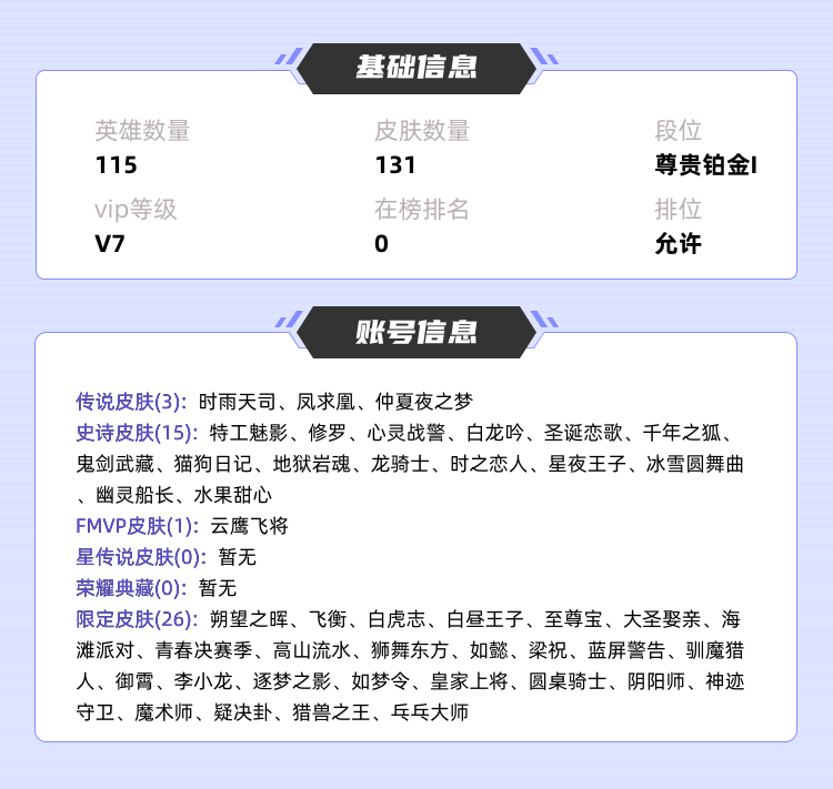 装备描述:>>>>>>毁号,涉及毁坏虚拟财产罪及计算机安全罪,请文明游戏素质游戏,让我们共建美好租号平台>>>>>> 本游戏账号: ,英雄多,皮肤多。FMVP皮肤1个,尽情享受FMVP皮肤带来的主角光环, 私人所属英雄皮肤有:李白 凤求凰||诸葛亮 时雨天司||貂蝉 仲夏夜之梦曜 云鹰飞将鲁班大师 乓乓大师||上官婉儿 梁祝||孙悟空 至尊宝||孙悟空 大圣娶亲||安琪拉 如懿||庄周 高山流水||明世隐 疑决卦||韩信 飞衡||韩信 逐梦之影||狄仁杰 魔术师||狄仁杰 阴阳师||后羿 如梦令||百里玄策 白虎志||米莱狄 御霄||典韦 蓝屏警告||花木兰 青春决赛季||项羽 海滩派对||赵云 皇家上将||鲁班七号 狮舞东方||女娲 朔望之晖||盾山 圆桌骑士||裴擒虎 李小龙||钟馗 神迹守卫||吕布 猎兽之王||兰陵王 驯魔猎人,等等 注意事项: A.游戏过程中请不要恶意挂机或者不文明发言;B.恶意挂机、顶号等行为将被拉黑无法再次下单;C.进入游戏后中途请勿退出登陆,否则无法再次上号;D.部分账号由于异地登录可能会出现密码错误提示,通常再尝试5-6次后可上号。 |||||||||>喜欢本账
