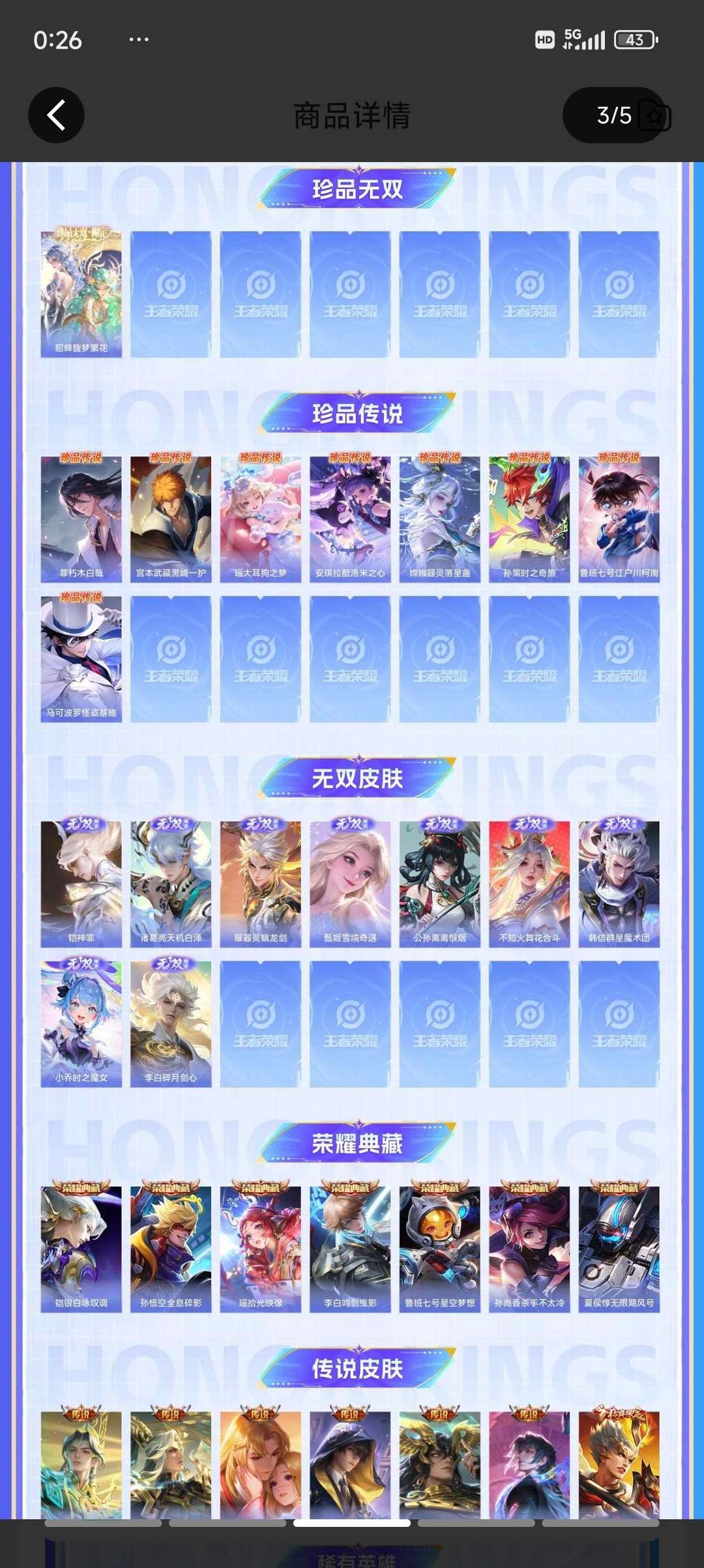 装备描述:珍品无双1 珍品传说8 无双9 典藏8 星元20 传说81 史诗186 限定246 英雄127 皮肤575 押金十块 不准用皮肤搓搓,我没几个了。用了1个扣2块押金。还有就是不能挂机,不能掉信誉分超过4。挂机扣5块。超过了一分扣2块。