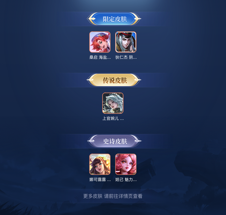 装备描述:英雄:貂蝉(貂蝉 唤灵魅影);上官婉儿(上官婉儿 神器·万象笔,上官婉儿 修竹墨客);朵莉亚;杨玉环;莱西奥;娜可露露(娜可露露 晚萤);王昭君;女娲;戈娅;鲁班七号;安琪拉;露娜;兰陵王;孙策;西施;廉颇;小乔;赵云;墨子;妲己(妲己 魅力维加斯);孙尚香;庄周;刘禅;孙膑;夏侯惇(夏侯惇 战争骑士);甄姬;典韦;狄仁杰;项羽;姜子牙;张良(张良 古海寻踪);橘右京;亚瑟(亚瑟 死亡骑士);后羿;虞姬;蔡文姬;大乔(大乔 伊势巫女,大乔 守护之力);黄忠;明世隐;米莱狄;李信;嫦娥;海月;澜;桑启(桑启 海盐诗旅);海诺;元流之子(坦克);元流之子(法师