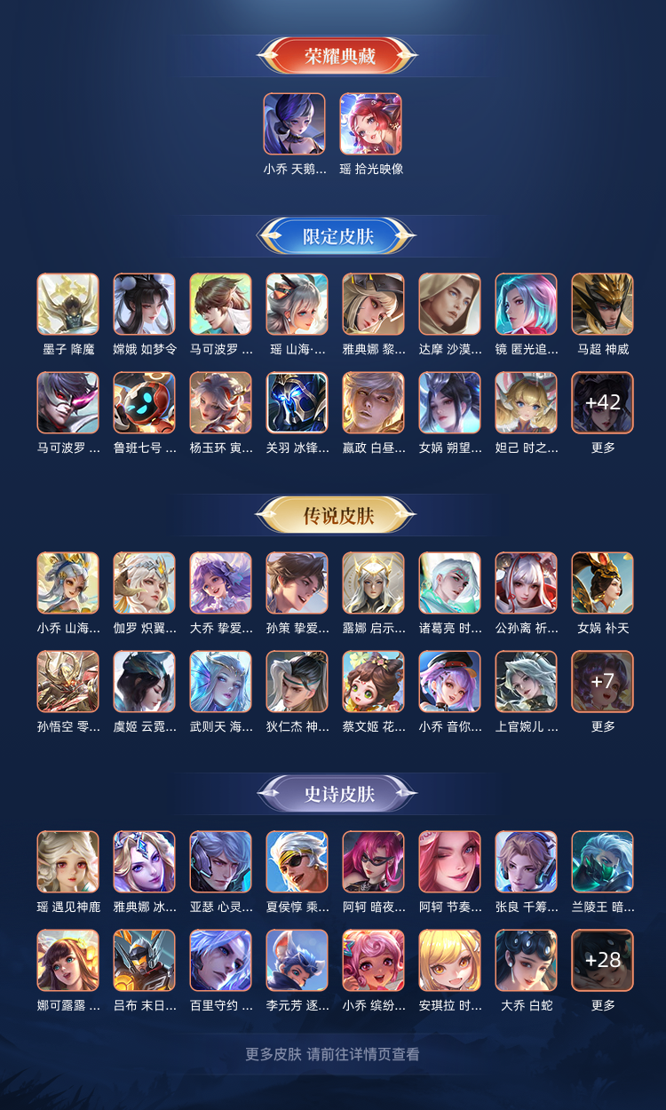装备描述:【荣耀皮肤】 4 小乔_天鹅之梦、瑶_拾光映像、武则天、小兵大耳狗甜茶会 【珍品无双】 1 貂蝉_馥梦繁花 【无双皮肤】 7 李白_碎月剑心、小乔_时之魔女、甄姬_雪境奇遇、诸葛亮_天机白泽、瑶_真我赫兹、公孙离_离恨烟、曜_器灵螭龙剑 【珍品传说】 7 鲁班七号_江户川柯南、安琪拉_酷洛米之心、瑶_大耳狗之梦、马可波罗_怪盗基德、嫦娥_器灵落星盏、张飞_兔狲蓬尾、孙策_时之奇旅 【星元皮肤】 4 荆棘舞步、岁雨灵司、幻海之心、零号雷霆 【传说皮肤】 63 朵莉亚_心动手记、孙尚香_乘龙问璇玑、西施_续相思、诸葛亮_时雨天司、云中君_群星魔术团、鲁班七号_时之奇旅、镜_炽阳神光、裴擒虎_寅虎赤拳、海月_金乌负日、大司命_死亡执政官、女娲_补天、小乔_音你心动、孙悟空_零号赤焰、澜_逐花归海、梦奇_胖达荣荣、诸葛亮_鹤羽星尊、大乔_时之奇旅、妲己_愿照众生和、赵云_乘龙铭钟鼎、西施_游龙清影、艾琳_觅芳踪、桑启_鸣野蒿、公孙离_祈雪灵祝、夏侯惇_霜北刀、铠_琥珀纪元、干将莫邪_画中仙、马可波罗_妄想实况、百里守约_碎云、女娲_愿照千秋盛、蔡文姬_愿照福禄聚、甄姬_至美化雀舞