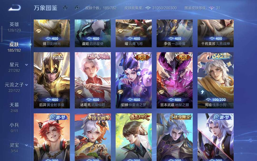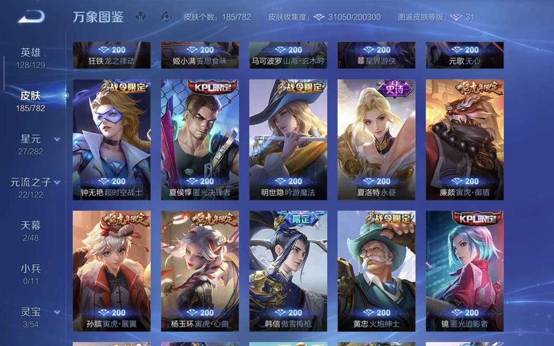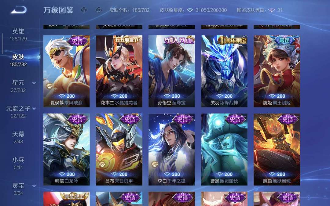 装备描述:贵族V8账号,128英雄+185皮肤,典藏李白鸣剑·曳影在手,热门限定拉满:至尊宝、冰锋战神、神威、一念神魔、蔷薇恋人、异界灵契… 18款传说皮肤+65款限定皮肤,虎年全套、FMVP、世冠、KPL限定应有尽有,排位/娱乐/开黑手感拉满! ✅ 账号无禁言,信誉7级,稳定不顶号 ✅ 秒上号,售后在线,诚信出租不跑路 ✅ 全英雄高熟练度,皮肤质量高,体验感拉满