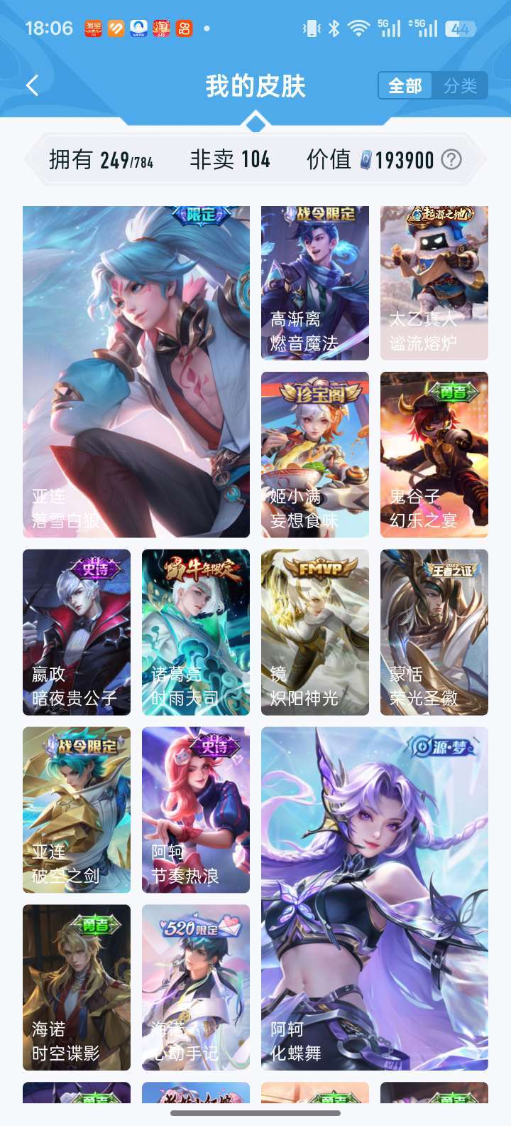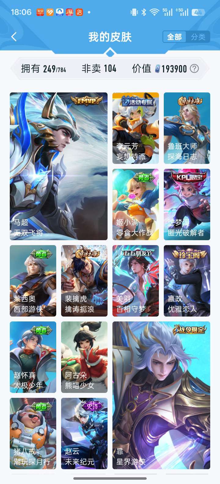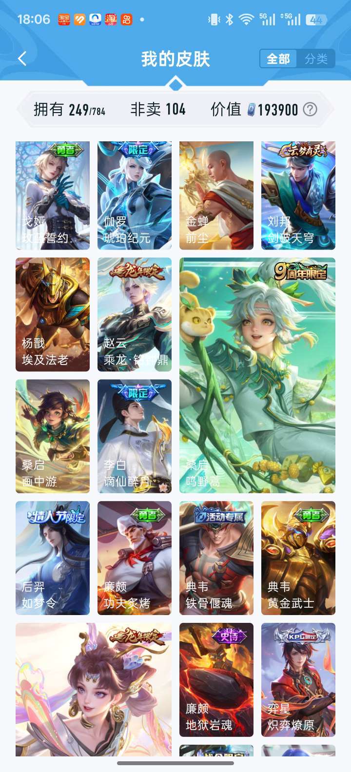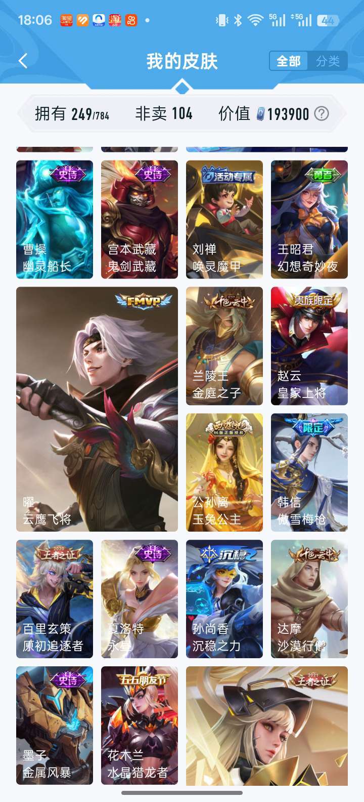 耀无双全皮 凯荣耀典藏 落雪白狼 李信赵云孙尚香澜年限 时雨天司 鹤归松栖多fmvp宫本差一全皮等