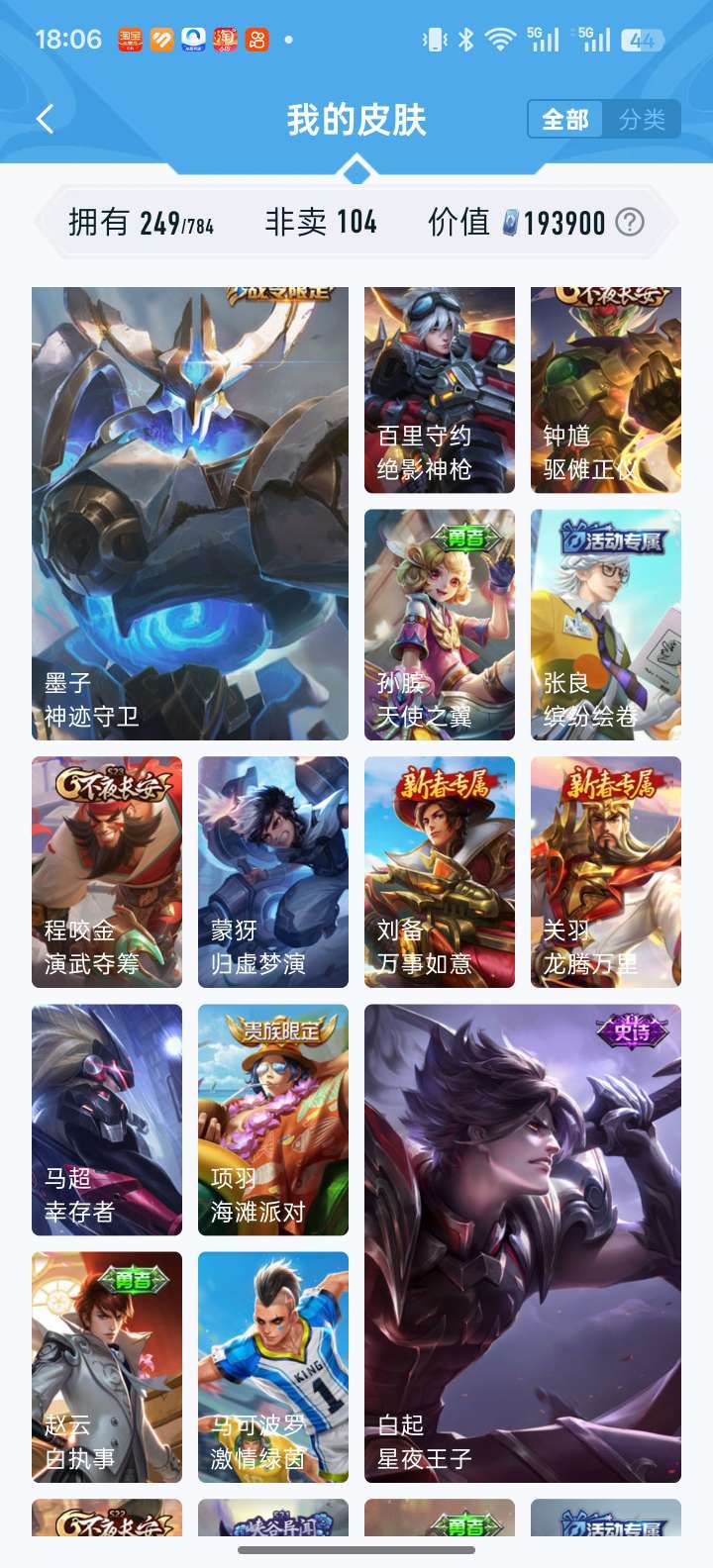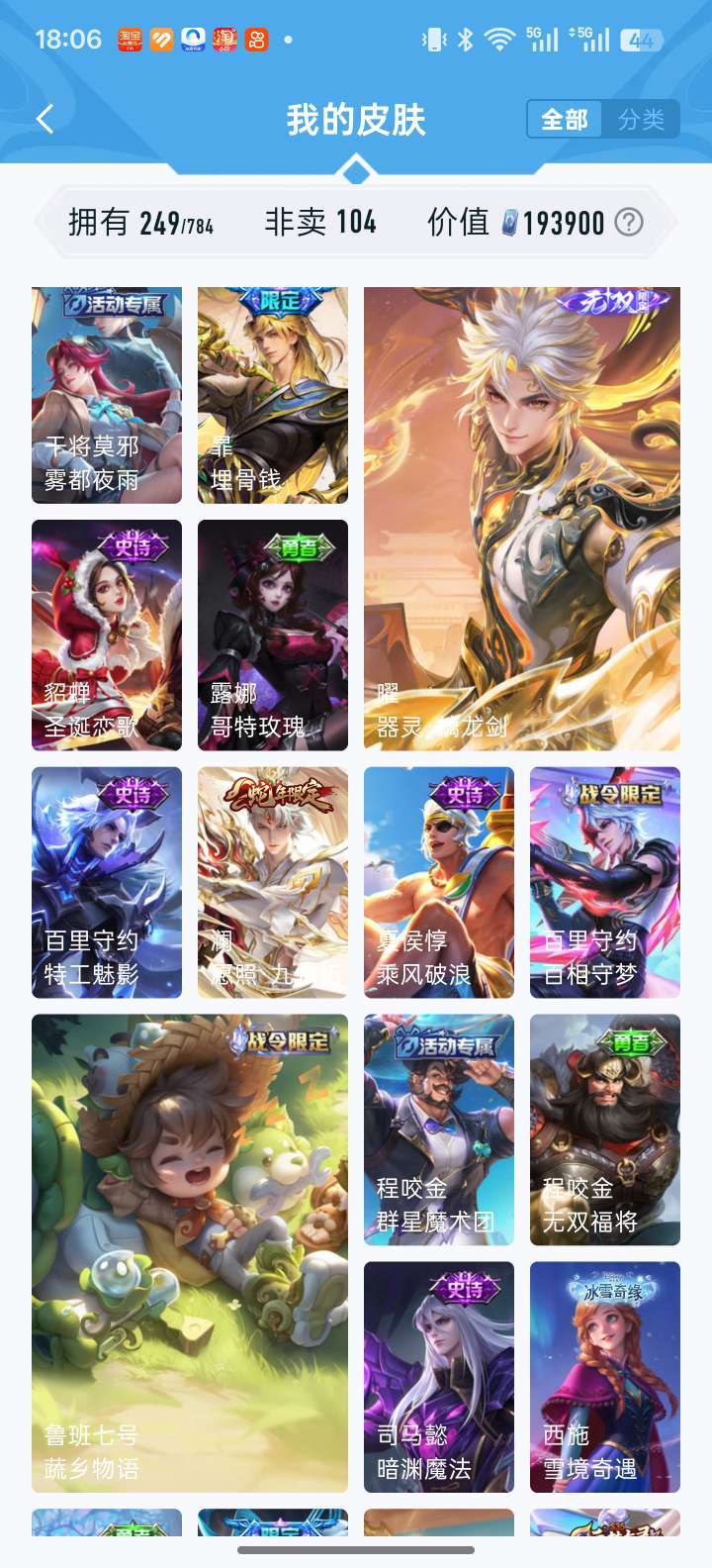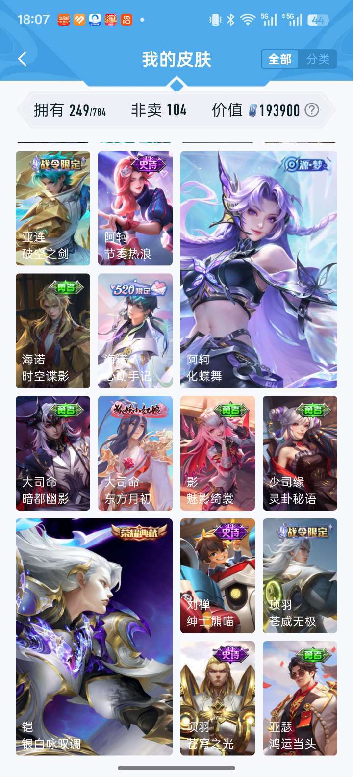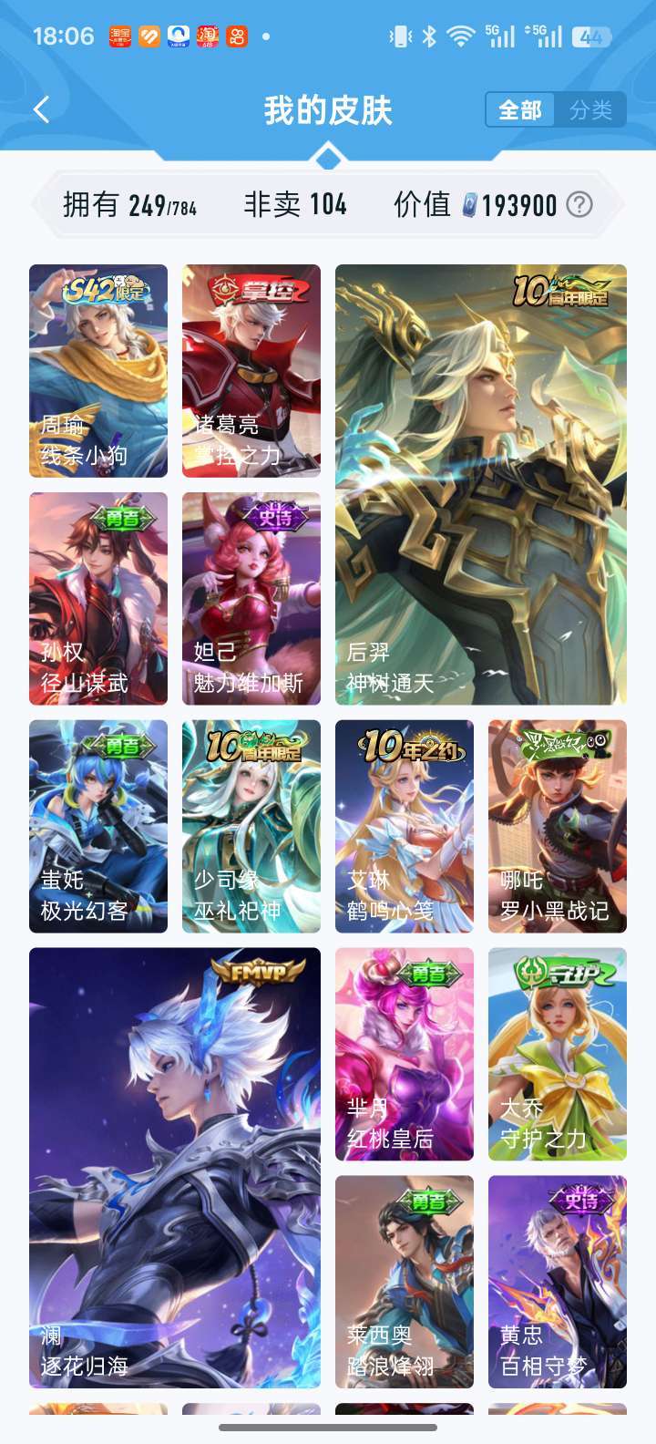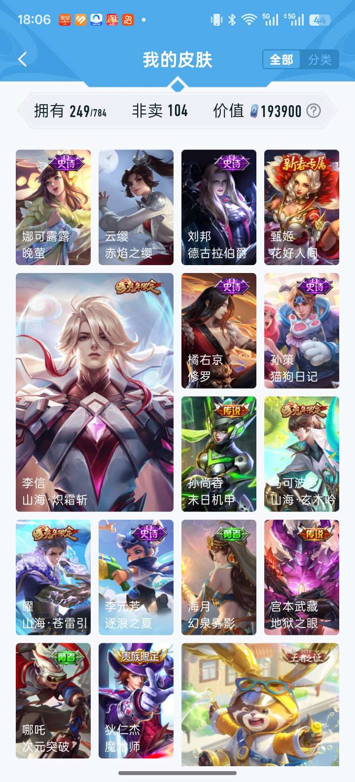 耀无双全皮 凯荣耀典藏 落雪白狼 李信赵云孙尚香澜年限 时雨天司 鹤归松栖多fmvp宫本差一全皮等