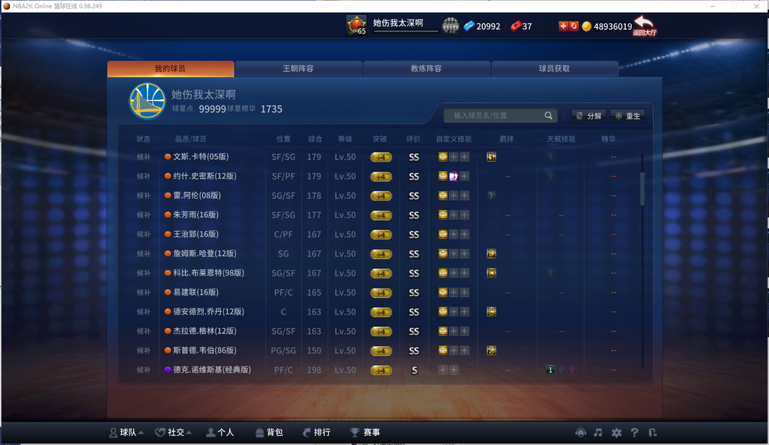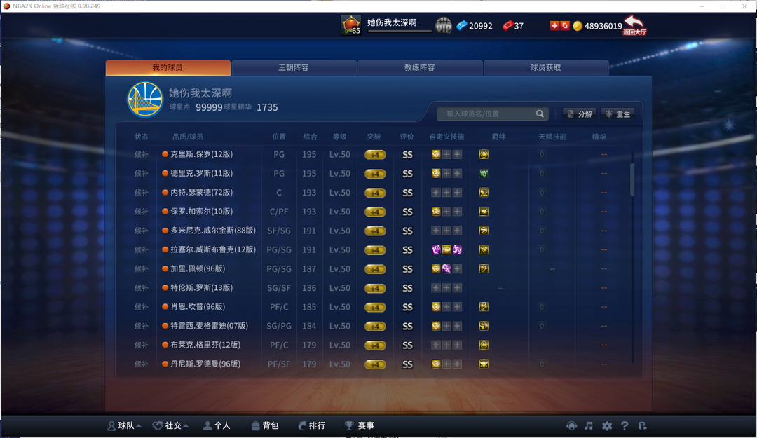 限制: 撤单率<50%才可租用此帐号装备描述:【3SSR/47SS 】【特训全十SG】【SSR91乔经典汤12杜】【SS经典司机麦迪】