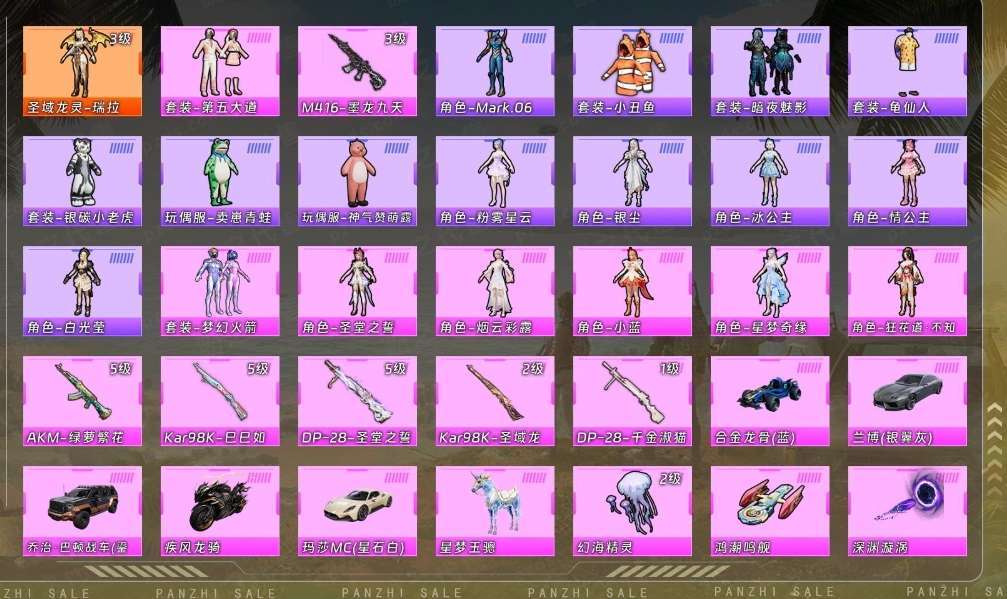 红色神装+皮肤火箭少女/瑞拉/螳螂/第五大道等多个稀有皮肤+6个多载具+车皮+多个飞行器+僚机
